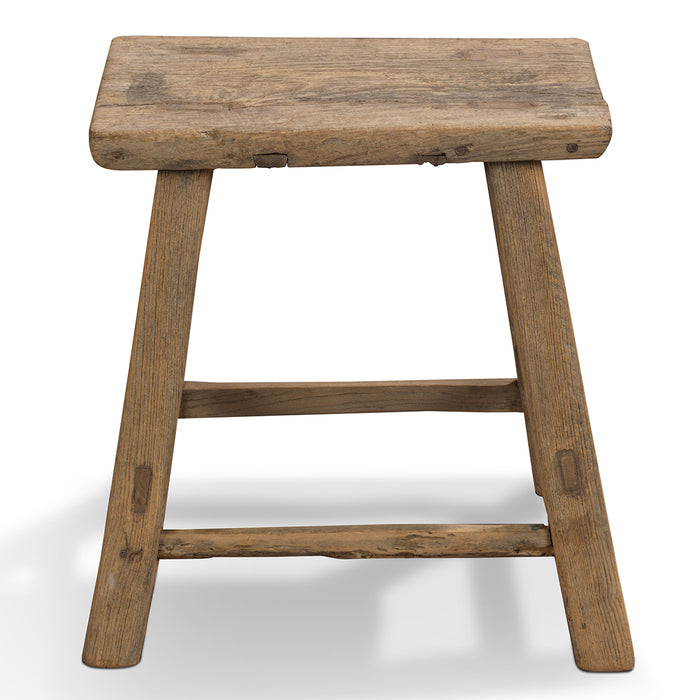 This old elm Chinese stool makes a functional, versatile addition to any room, or could even be used outdoors as extra seating during the summer. With a rustic charm and a simple, traditional design seen in China for centuries, the stool is made of elm wood using traditional mortise and tenon joints. Single stretchers add stability and the generous seat would make it ideal as a side table next to a bed or sofa, or even in a bathroom for towels or toiletries.