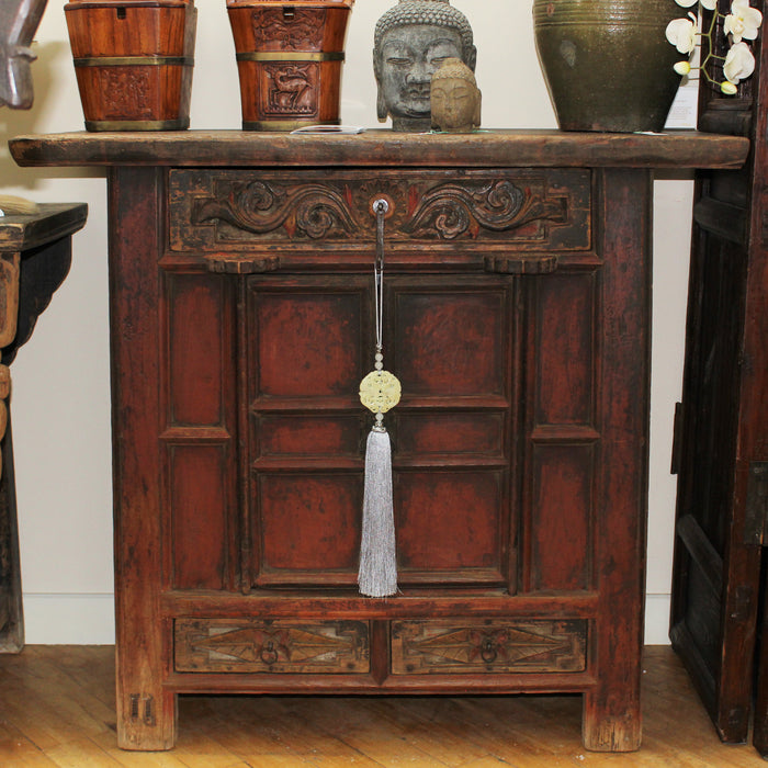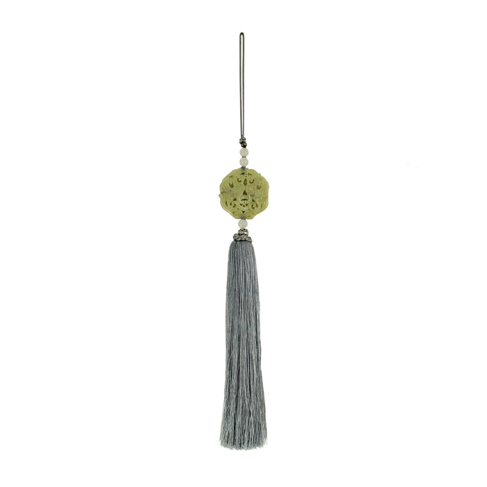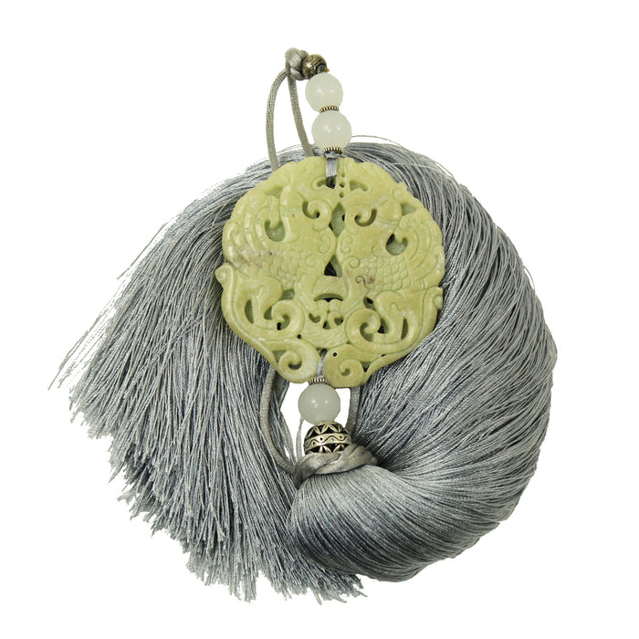 The jade centrepiece of this silver tassel depicts a pair of dragons facing each other. The tassel is part of our wide collection of meticulously carved soapstone or jade tassels in a stunning array of designs and colours. Both decorative and versatile, they are a perfect way to add a touch of charm and vibrancy to any space, whether hung on a wardrobe, cabinet or wall, or as elegant curtain ties for adding a sophisticated touch to an interior.