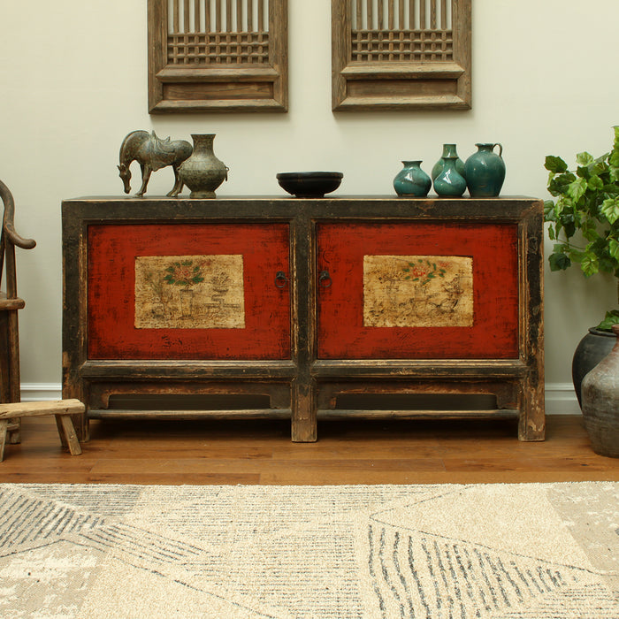 The sideboard boasts its original finish and paintings, now more muted compared to the once vibrant colours. The cream central rectangle on each door is adorned with personal possessions such as flower vases, showcasing the owner's status and importance. Newly added removable shelves add further practicality, and with its unique character and history, the sideboard would make a perfect statement piece in a reception or dining room setting.