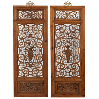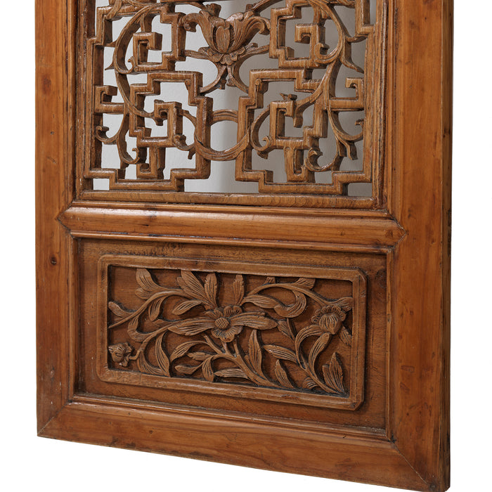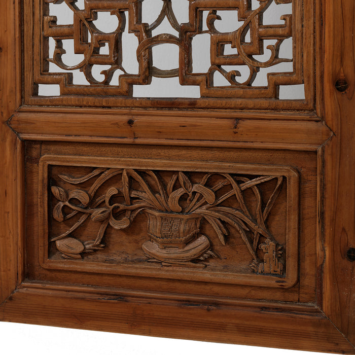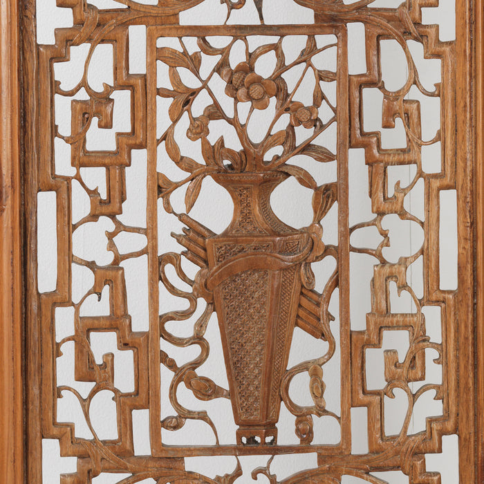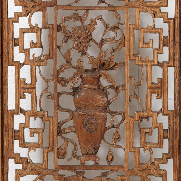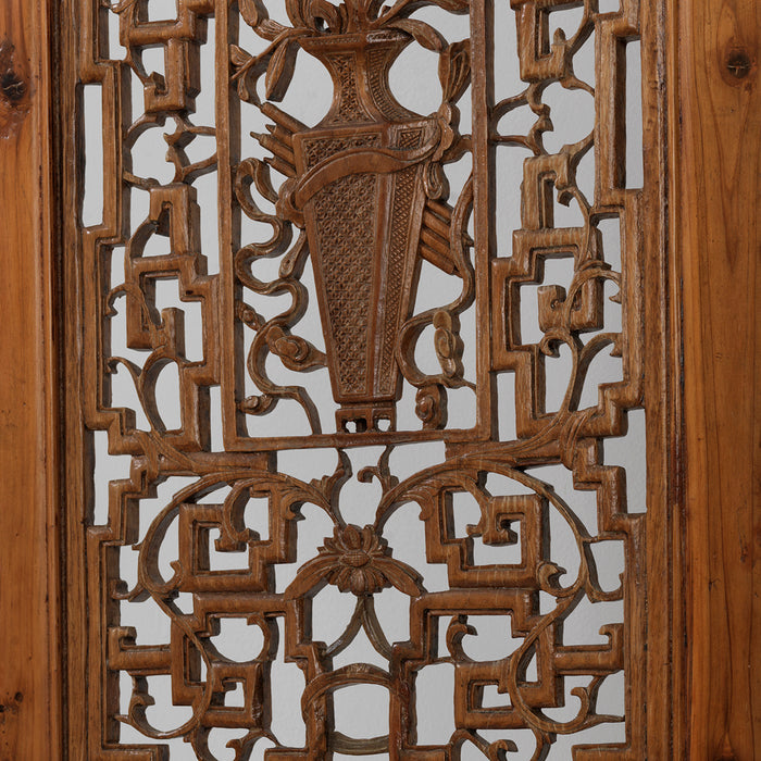 These beautifully carved panels are in elder wood and originate from Jiangsu province in eastern China. They would have been designed as internal window screens, allowing air to flow through the home during the hot summer months while providing a level of privacy. The main carvings on each large, central panel show flower vases, each set within intricate scrolling patterns interspersed with a meandering floral design. The upper panels are carved through in a similar pattern, whilst the lower panels are in deep carved relief, again showing a vase and flowers.