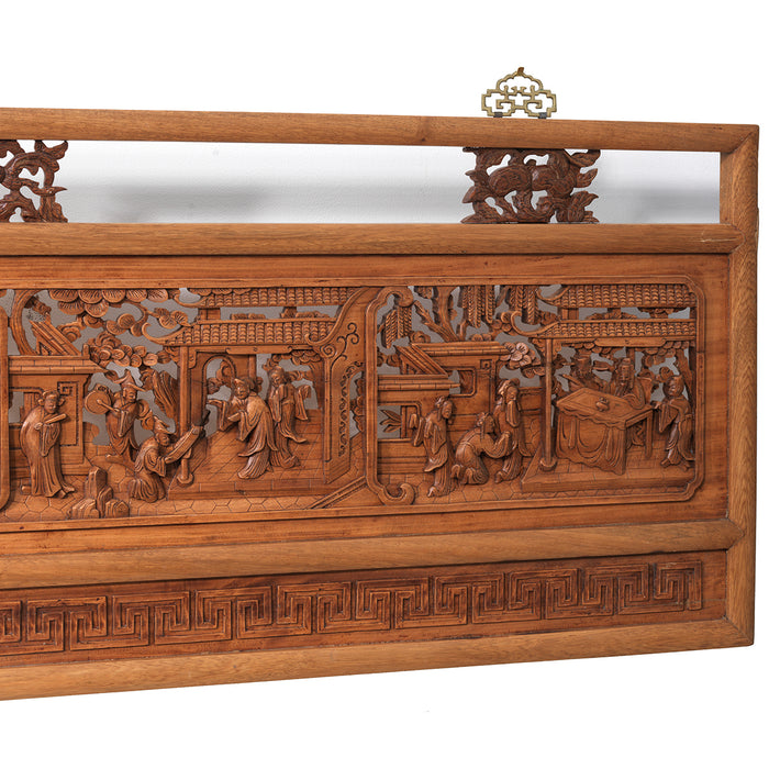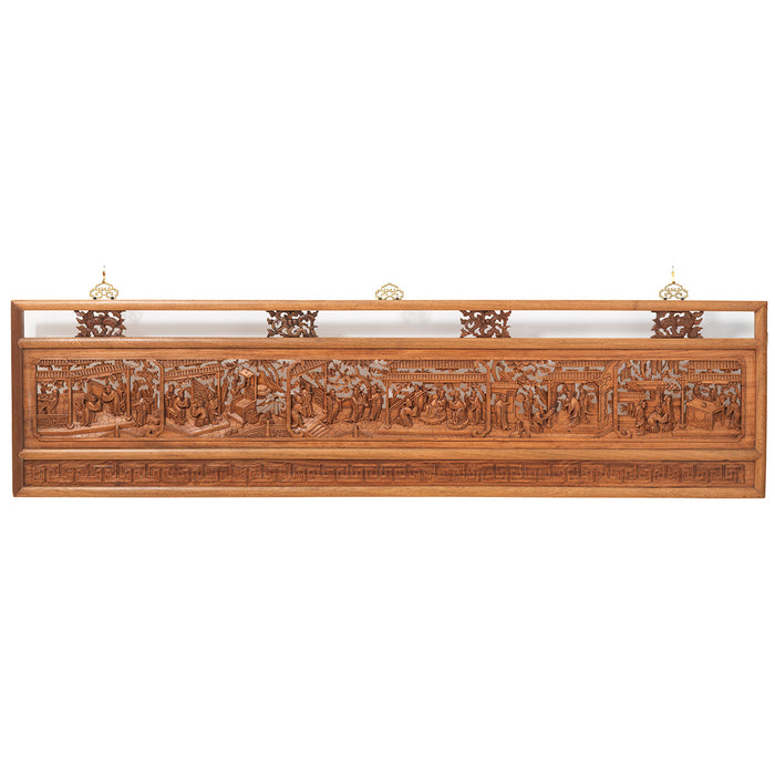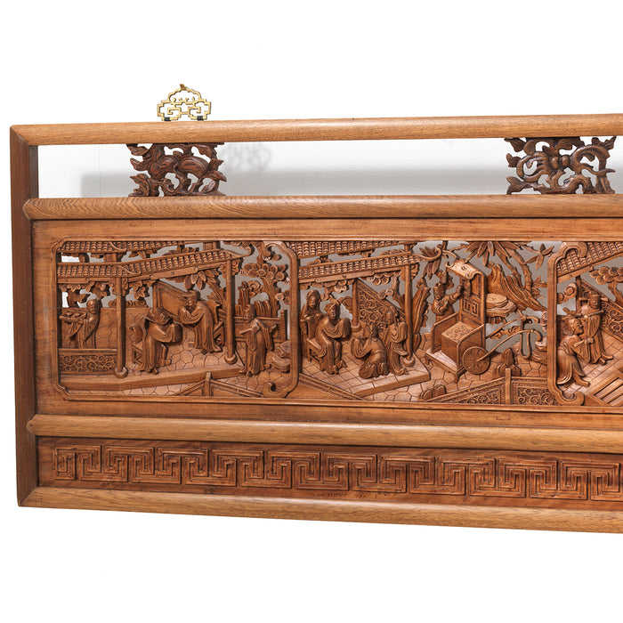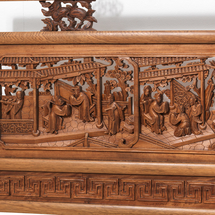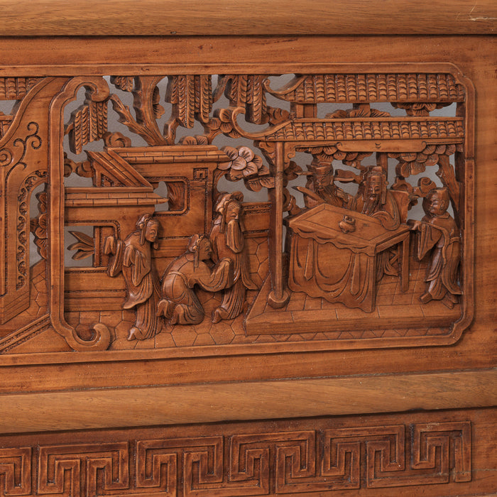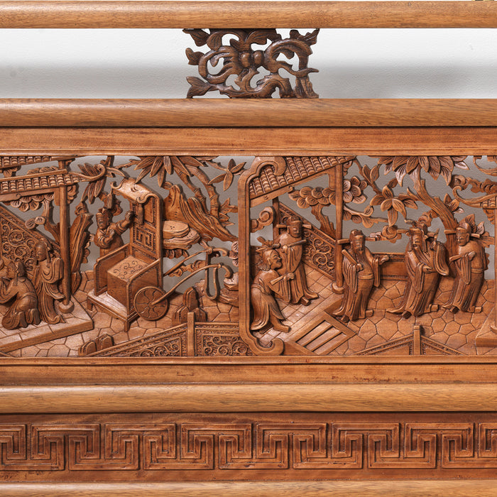 This intricately carved panel is part of an antique daybed from the city of Nanjing, Jiangsu province. It would have formed the back rail, with similar rails at either side. The panel boasts a stunning relief carving showing scenes of court visitors in the central section. When combined with the two side rails, the the full scene portrays a classic episode from Chinese history.