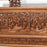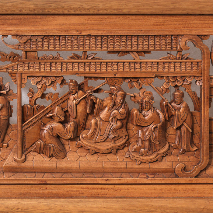 The level of skill required to create the panels, all carved by hand, is remarkable. The talent of the master craftsman that would have worked on the daybed is clearly evident in the many fine details depicted in the flowing robes and facial expressions of the various characters presented, as well as in the background setting of palace buildings, tress and mountains. This luxurious item would have taken many months to produce, certainly created for a customer of considerably wealth. Now, this and the two smaller panels would serve as a delightful, unique adornment for any wall, either displayed as a set or individually.