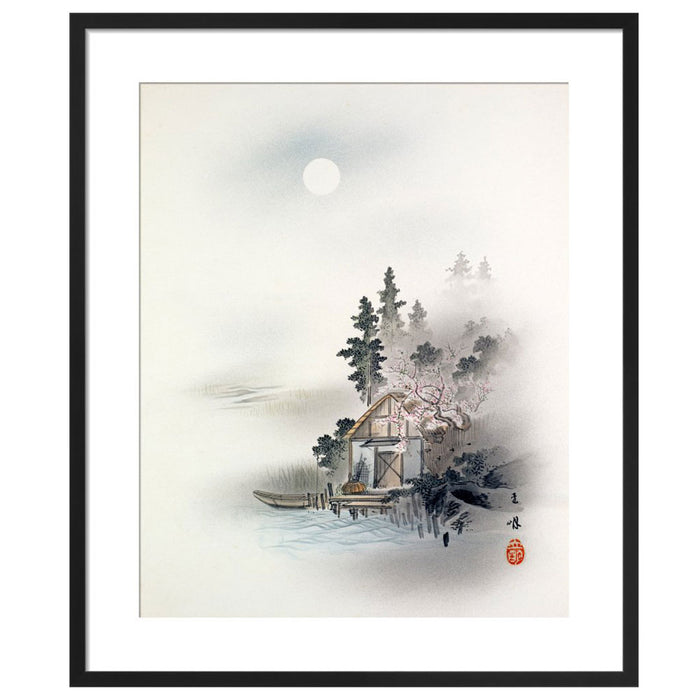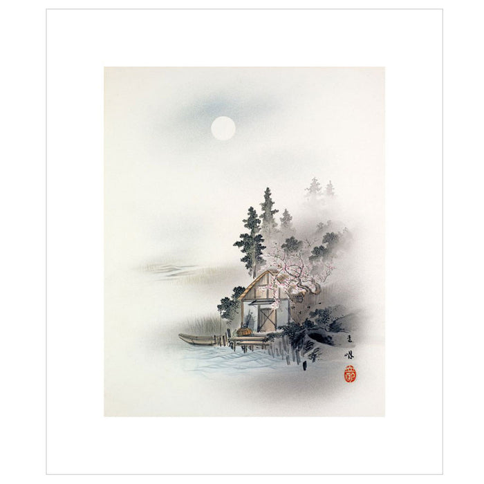 Based on a 19th century watercolour by an unknown Chinese artist, this print shows a wooden hut and boat on the shores of a lake.
