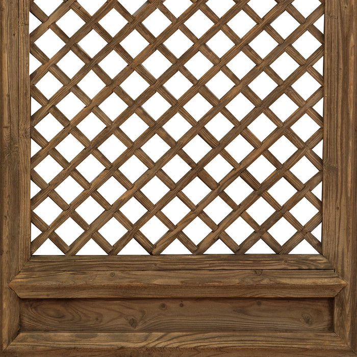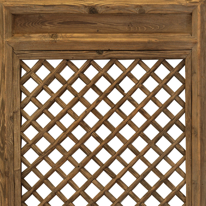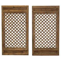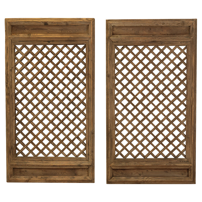 These traditional wooden panels are from a home in China's Shanxi province, where they would once have been used as part of a set of window panels in a traditional courtyard home. The clean, criss cross lattice design at the center of each panel is surrounded by chunky elm frames. The panels would be ideal today as a distinctive and wall accent above a console table or sideboard. Sold as a pair, the price shown is for both panels. Two similar pairs are currently available.