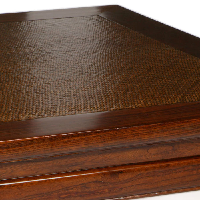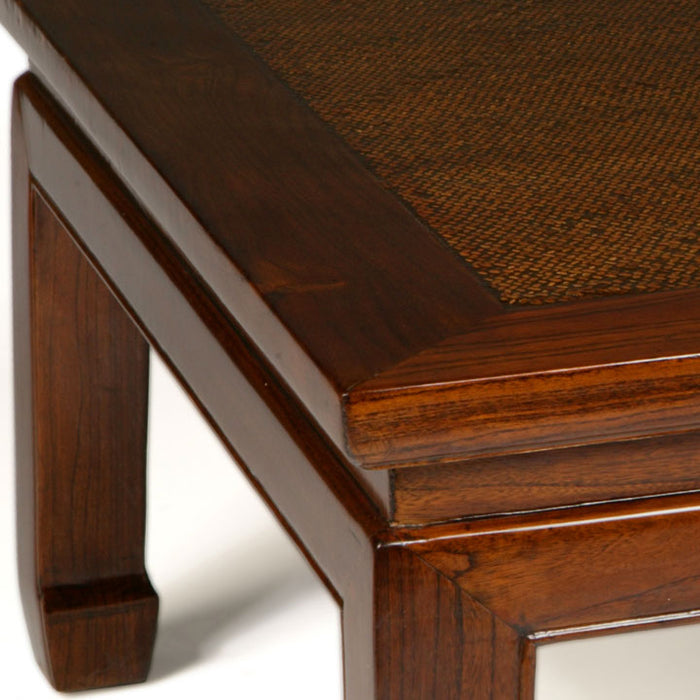 This square shaped warm elm coffee table is based on original Chinese daybeds, but reduced in size to be more practical in a contemporary setting. Daybeds were used in Chinese homes as seating during the day, often being moved around for different uses, and for sleeping on at night. They were often made with solid wooden frames but with either rattan or woven top panels to add comfort. Our smaller, square version has a rattan top panel, smoothed and sealed to give a hard wearing surface. The table has the 'horse hoof' feet and 'waisted' top that are typical of Chinese tables.