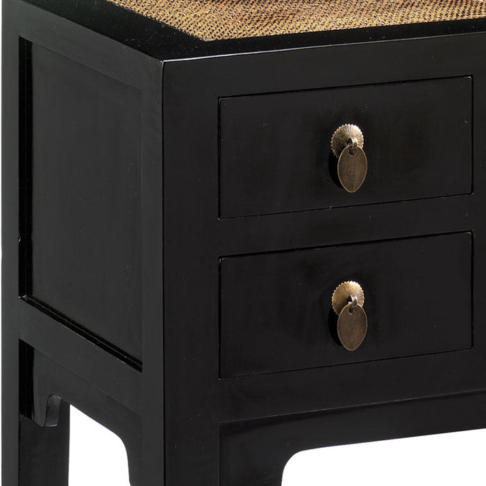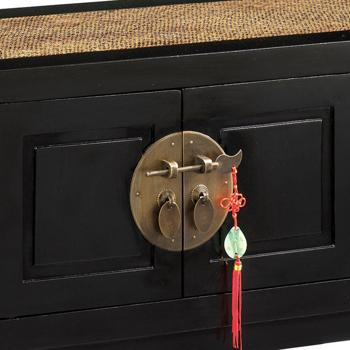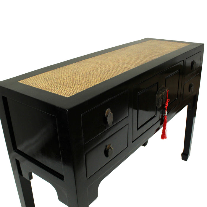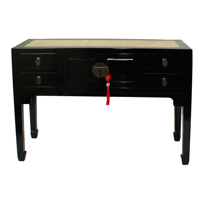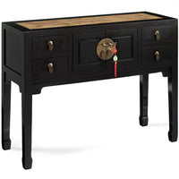 Tables like our black lacquer ladies cabinet were made popular during the Qing dynasty, similar style consoles with drawers and doors were normally used in a lady's sleeping quarters as a dressing table, and hence were known as 'ladies' cabinets'. There is plenty of storage space provided by the central doors and the drawers at either side, while the top is set with a rattan panel to provide a hard wearing surface. Typical oriental features include the narrow legs ending in classic Chinese 'horse hoof' feet, along with the circular door hardware and brass handles. Use one as an unusual console table with storage space or as a dressing table in a bedroom - great combined with one of our Square Stools, which will slide underneath when not in use.