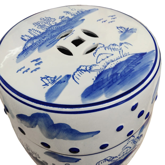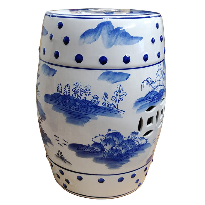 These lovely ceramic stools are decorated in a classic Chinese blue and white glaze with a traditional design based on a willow pattern landscape. They can be used both outdoors as a garden seat in the summer months, or as a stool or side table indoors.