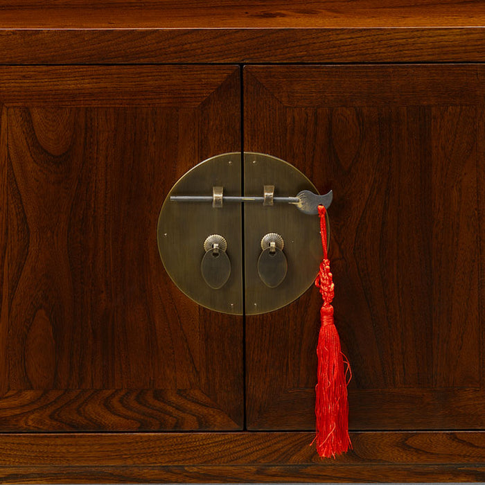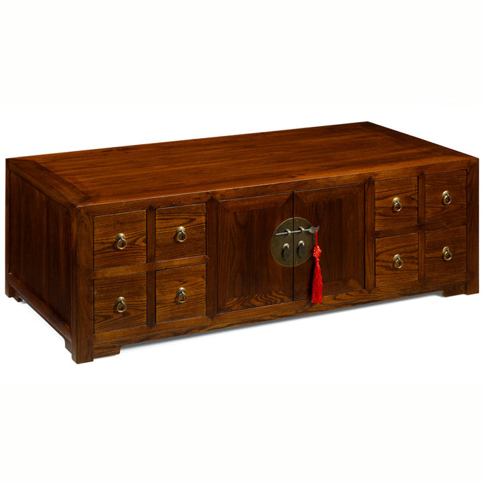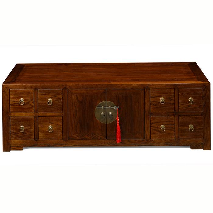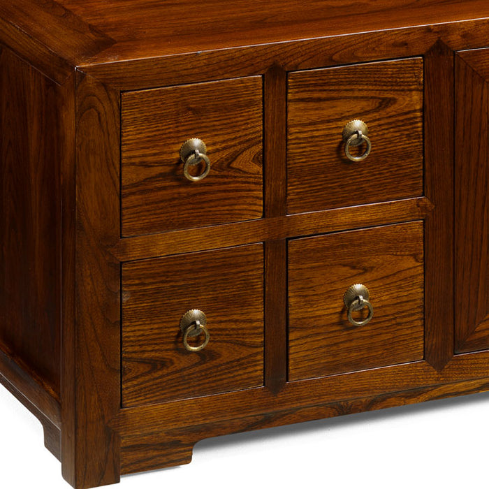 This handsome low cabinet in our warm finish is a wonderfully versatile piece of furniture and although designed by us with the modern home in mind, it still has a strong oriental style. The cabinet looks exactly the same from both sides as it includes two set of doors and the eight drawers open in both directions. This makes it ideal in the centre of a living room as a coffee table with plenty of storage space inside. Alternatively use it as a media unit for a TV - the doors are easily removed to feed wires through the back and the drawers, each divided into 3 sections, are perfect for holding CDs and DVDs. Beautifully made from reclaimed elm with brass hardware.