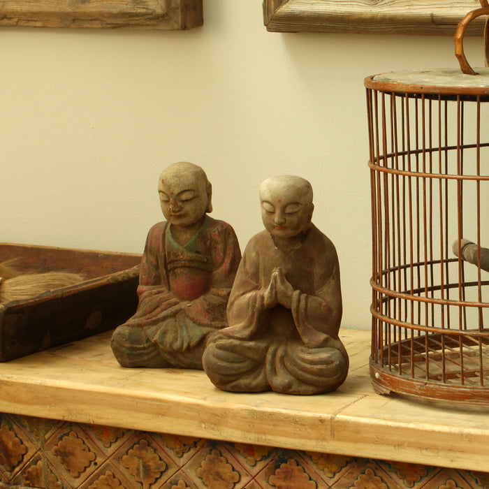 These serene looking buddhas, seated in the lotus postion with hands clasped in prayer, are hand carved from wood and given an aged appearance. As they are produced by hand, each one is very slightly different and their robes are painted in muted greens, reds and blues.