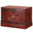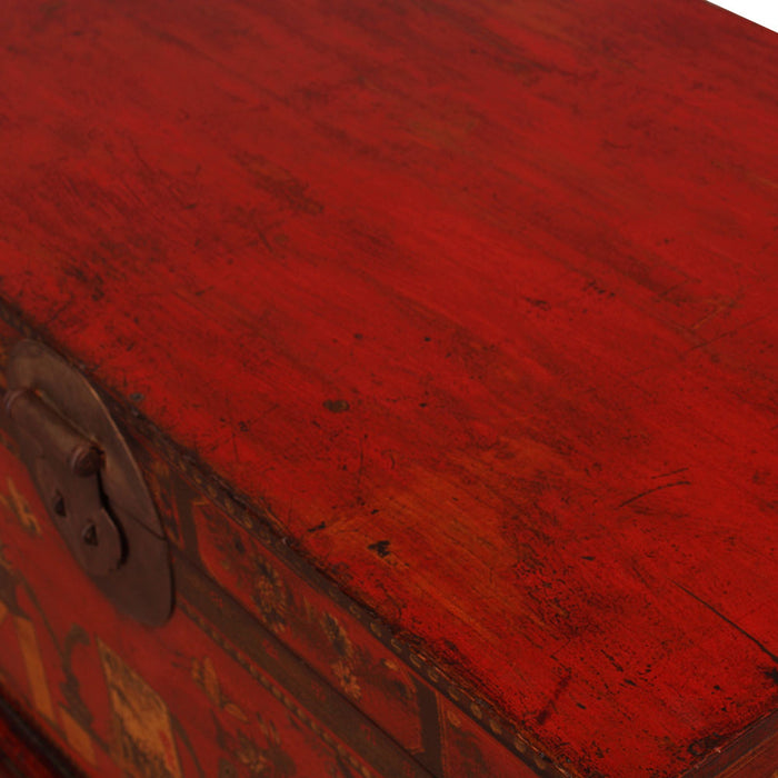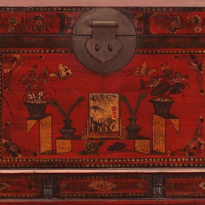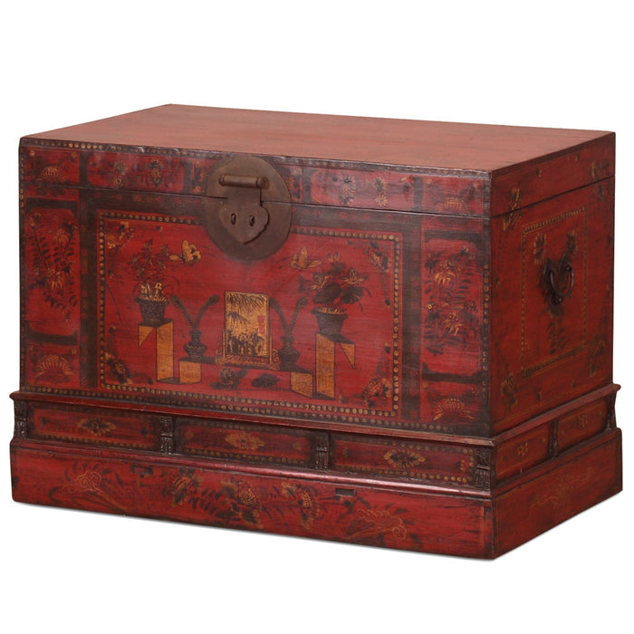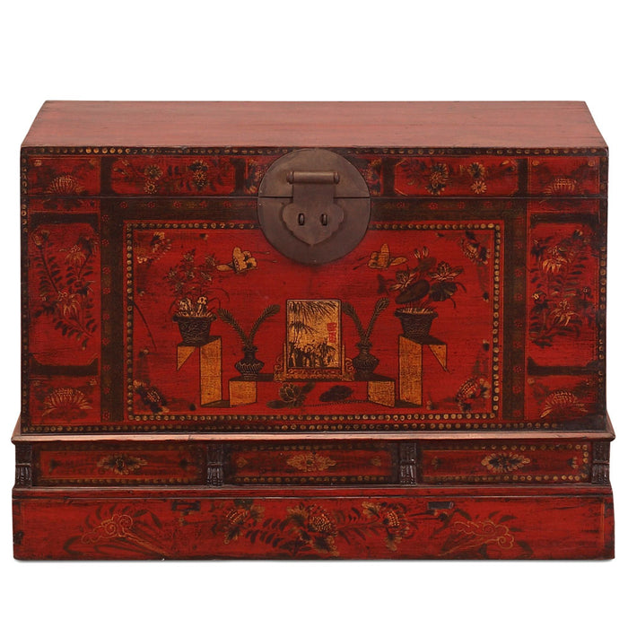 This large, deep, beautifully decorated trunk would most likely have been used for storing clothes and other personal possessions in a home in Shandong province, northern China, The old red finish and now muted paintings are still largely intact, the paintings showing vases and various items associated with a scholar, including a painted table screen in the centre. The upper part of the thick base is divided into three panels, each painted with a simple floral design. The hardware on the front of the chest is new, but similar to the lost original lock plate. The chest's generous proportions provide a huge amount of storage space for clothes, bedding or other items - ideal for getting on top of the clutter!