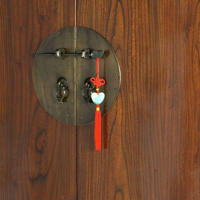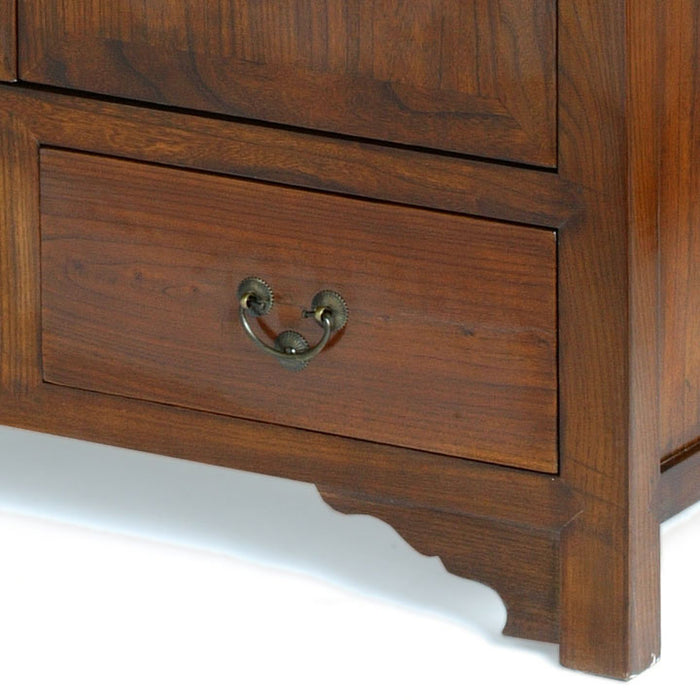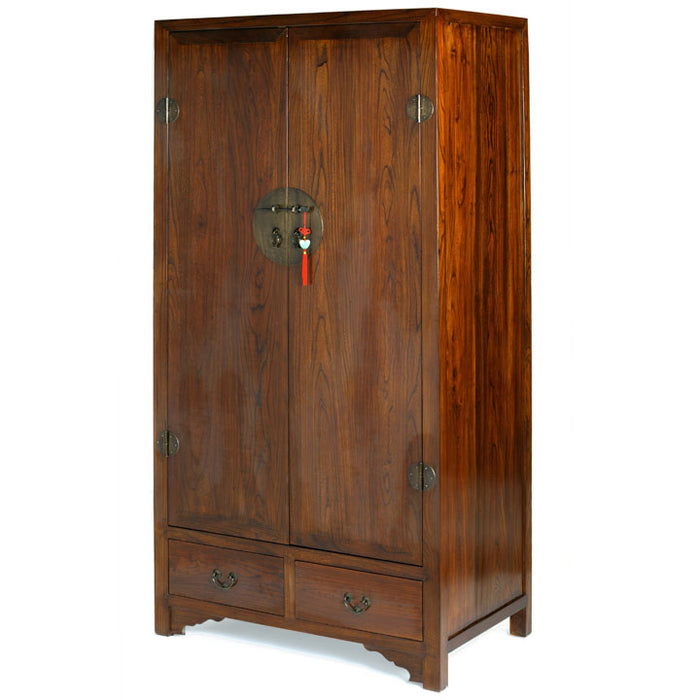 This solid, simply styled wardrobe in warm elm is a reproduction of the thick framed 'square cornered' cabinets that were commonly made in Beijing and other parts of northern China. The main difference in our version is the addition of a wooden hanging rail on the inside - something unfamiliar to Ming and Qing Dynasty Chinese who would always fold their clothes for storage inside cabinets and chests. We have also included three removable shelves inside, giving you the option to use it as a more general cupboard if needed. The brass circular hardware on the doors adds simple decoration to the wardrobe's otherwise pure design and gives it a recognisably oriental feel. Due to its size and weight, the wardrobe comes in two sections (each 50 x 60 x 200cm) that easily slot together and are secured with hidden screws on the inside.