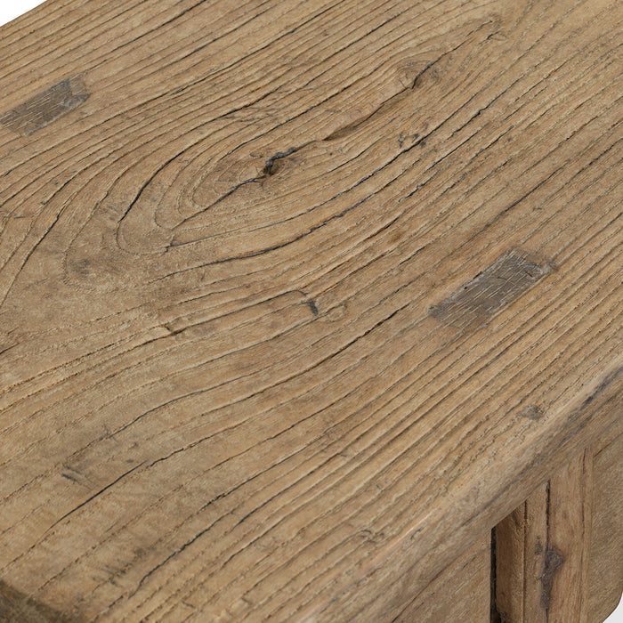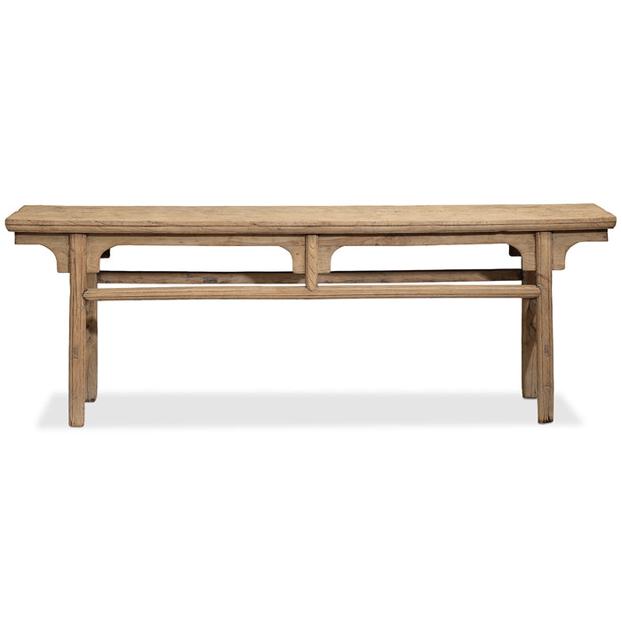 This lovely, long display table would make a wonderful, statement console today in a hallway, living or dining room. It is made from elm wood, with the top extended surface made using a single elm plank. The table would originally have been used as an altar table in China's Shanxi province, with offerings to ancestors placed on the surface. The original finish has been stripped back to reveal the pale, natural colour of the wood with its deep, distinctive grain. The legs are supported with double stretchers at the sides and fit through a shaped apron to the front and rear into the thick table top. A unique piece that is narrow enough to fit into most spaces as an unusual console.