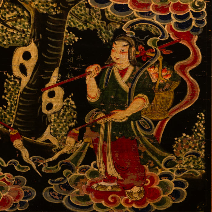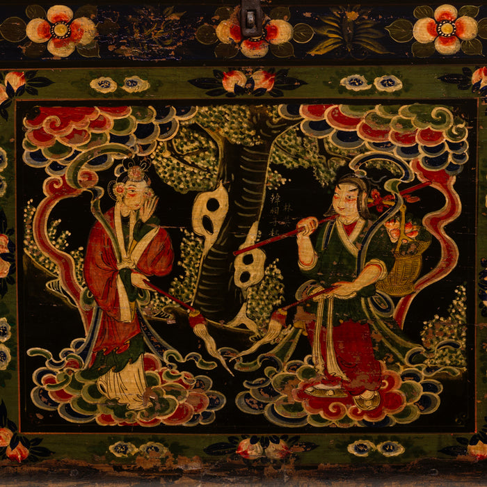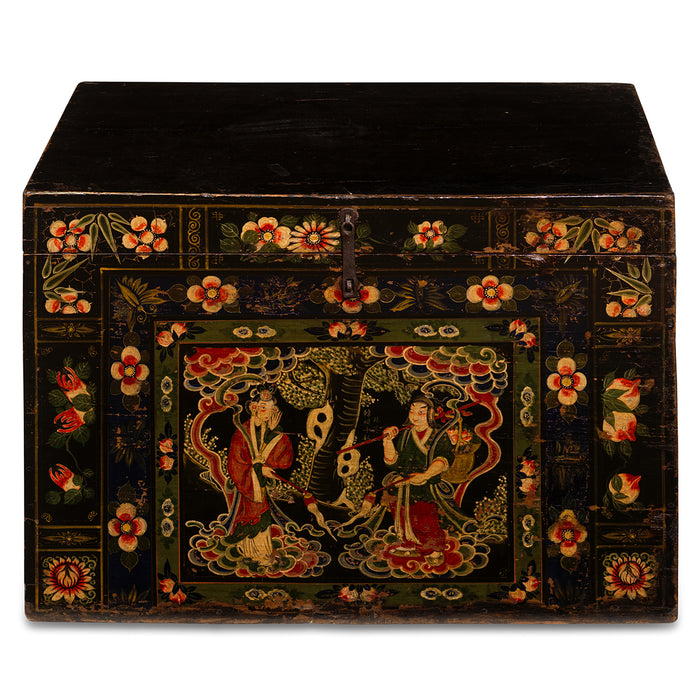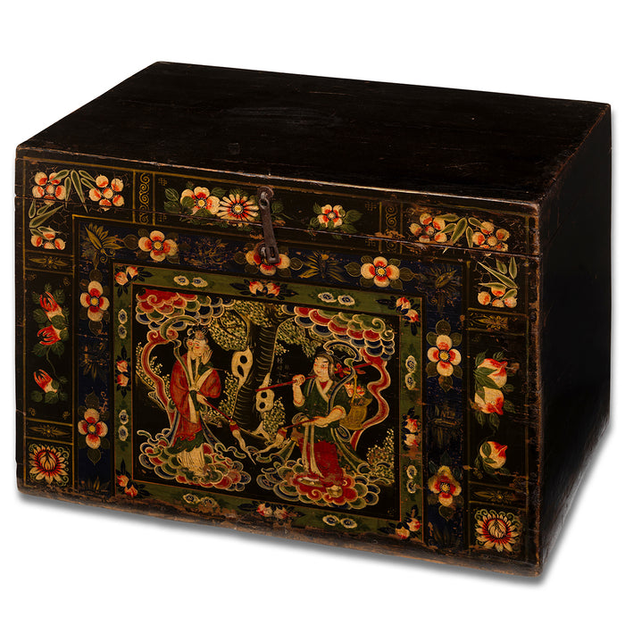 This colourful blanket trunk is a lovely example of the type of chests commonly referred to as opera trunks in China. The vibrant, colourful paintings on the front have worn over time to softer colours, but are in excellent condition, with the two central figures and surounding floral designs still clear. The man and woman depicted in the main painting most likely represent a pair of lovers from a traditional Chinese opera or folk tale. They are flanked by various flowers including a pair of pomegranates to the right hand side - a symbol in China for fertility. The theme suggests that the trunk might have been produced as a gift for newlyweds, perhaps along with contents of silks, fabrics and other treasures. The hinged lid has a simple metal clasp fitted at the front to allow it to be secured.