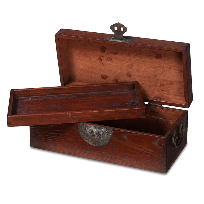 This beech wood box was originally used to store small personal items in the home or when travelling. Crafted in Zhejiang, eastern China, the handles and front clasp are original. The box includes a removable top tray, making it ideal today for storing jewellery.