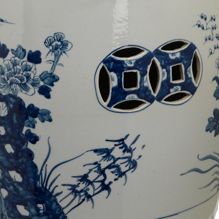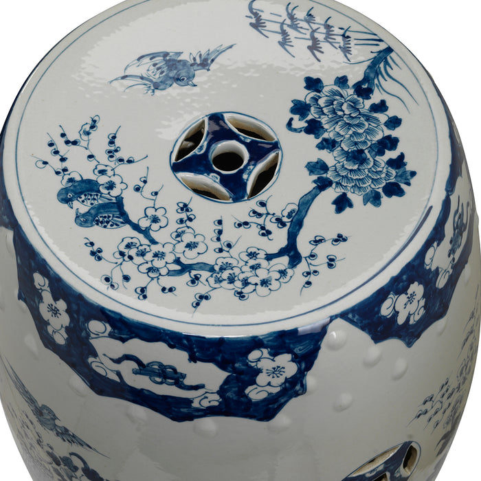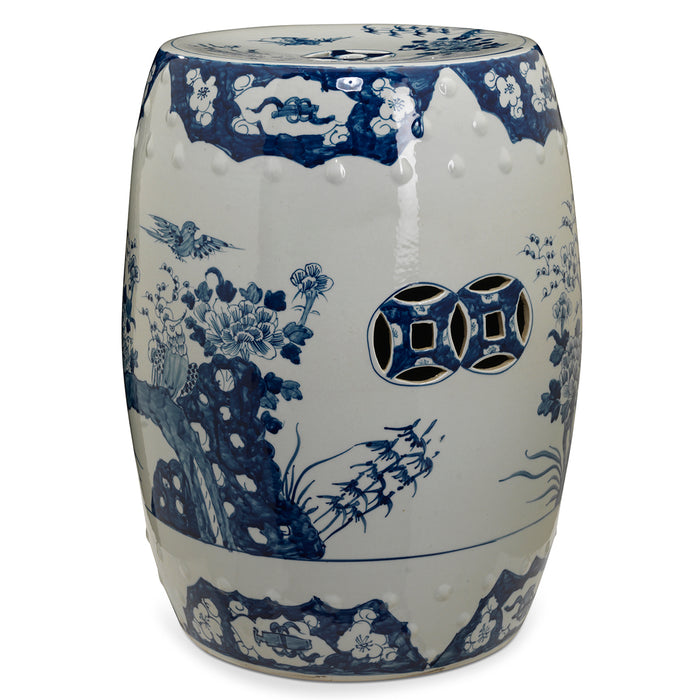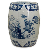 These lovely ceramic stools are reproductions of pieces that were used for indoor and outdoor seating particularly in southern China for centuries. These ones are in a classic Chinese blue and white glaze, decorated with a design of trees and birds. They are not frost resistant, but can be used outdoors during the summer months and make lovely little side tables.