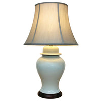 This stunning general jar lamp is finished in a creamy celadon crackled glaze. Mounted on a hardwood base it is supplied with a fully lined silver/gold satin shade. 60W max B22 bulb. Overall height including shade is 67cm.