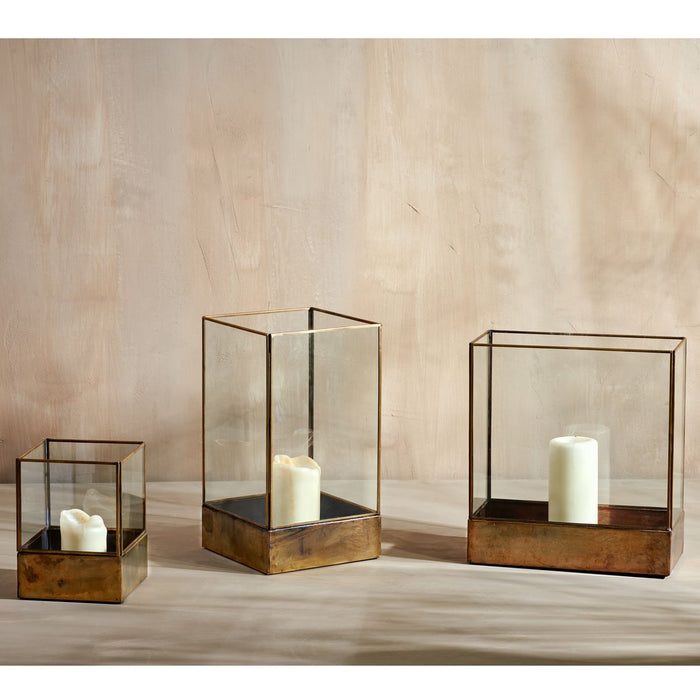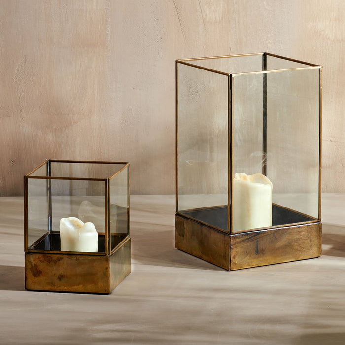 Our Sampara Storm Lanterns come in three sizes and makes striking centrepieces either individually or grouped together. The antique brass has an attractive patina, particularly visible on the deep base of each lantern. Place a church pillar candle inside for soft, ambient lighting.