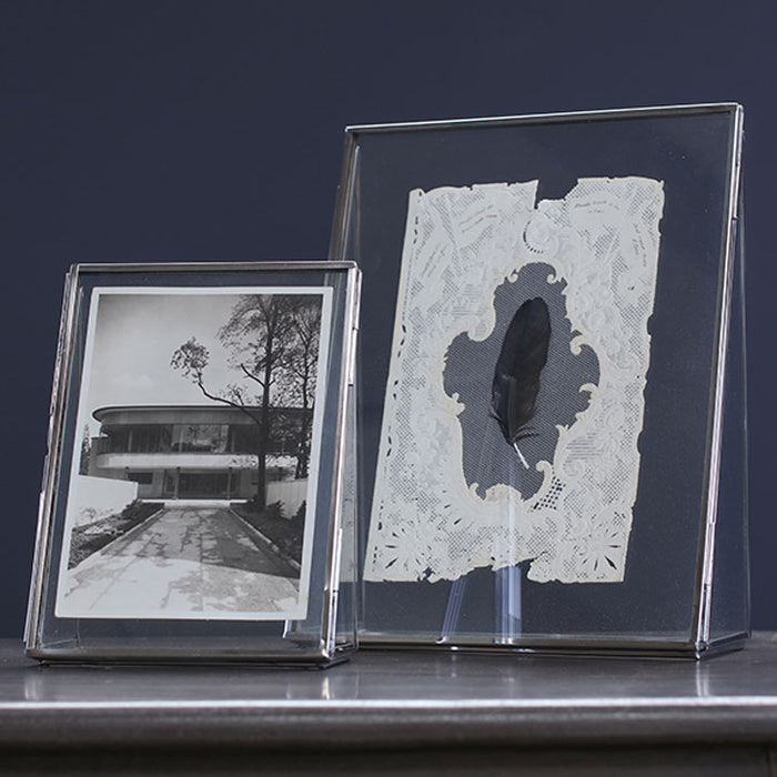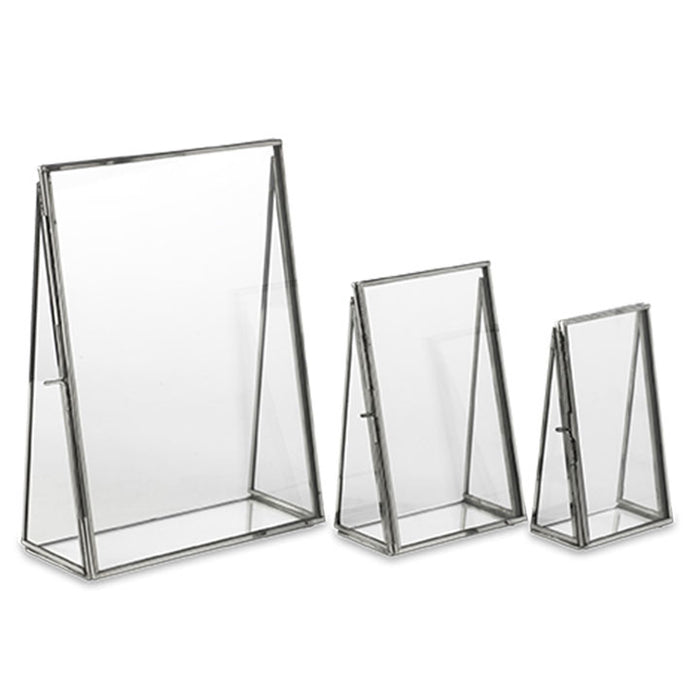 These free standing photo frames are hand forged from silver metal, and are perfect individually or grouped together, not only for photographs but for creating our own unique display of art or favourite keepsakes. The clean, straight lines of the metal perfectly frame the simple glass panels. Note that the metal surround is hand forged and shaped around the glass, leaving visible solder marks on each join. This makes each one individual, showing the story of how each piece was created. Available in three sizes as shown.