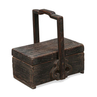 This old storage box was once used to transport food. It is made from elm and the attractive grain of the wood is clearly visible through the now worn black lacquer finish.