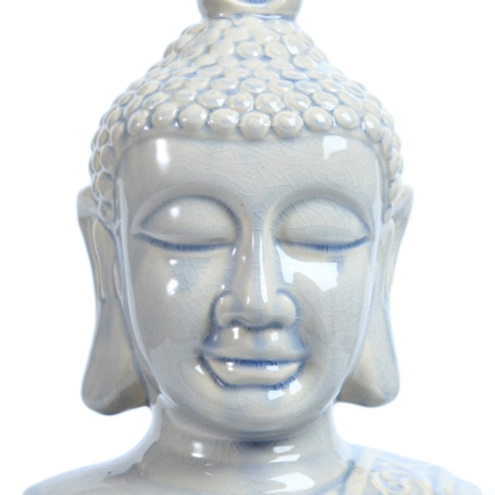 Expertly made from high-quality porcelain, the sculpture features finely sculpted details including the textured curls of the Buddha’s hair, a graceful flame-like ushnisha at the crown, and an ornate robe with delicate scrollwork patterns. The smooth glossy finish highlights the intricate craftsmanship while giving the piece a timeless, refined appearance.