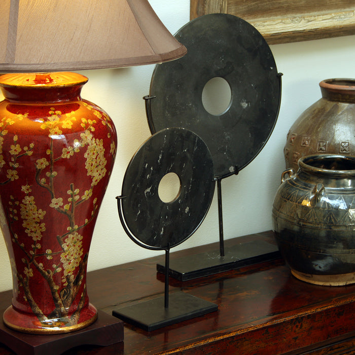 These smaller versions of our stone discs make lovely, unusual ornaments. They are known as 'bi' (pronounced 'bee') in Chinese and are made from jade or other stone, with a black metal stand. The outer ring and central hole symbolise heaven and earth, and they are thought to bring happiness and peace into the home. Please note that each stone ring is individually made and so will differ slightly from the one shown as an example.