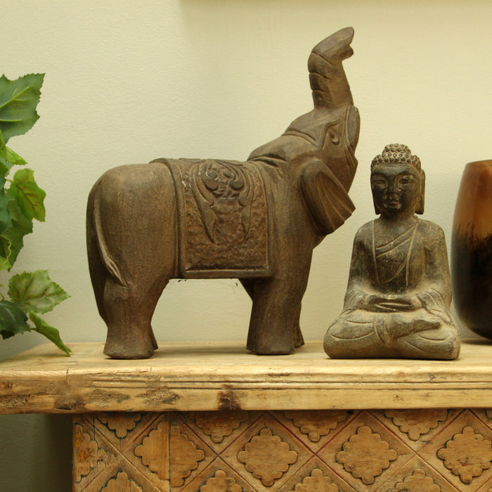 Shown with its trunk raised in mid trumpet, this lovely elephant is carved from stone and is perfect as an ornament either indoors or outdoors. The stone is carved to show detail of the elephant's trunk and ears, along with the a saddle. Available individually or as a pair (with left or right front foot forwards).