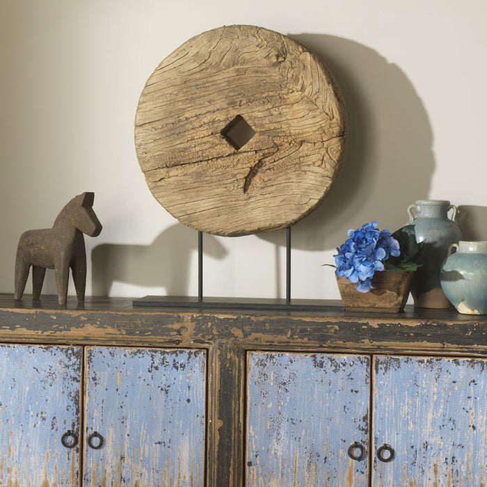 These old wooden cart wheels have been mounted on metal stands to give them a new lease of life as unusual table ornaments. The appearance, size and overall shape of each one varies slightly as each wheel is individual, but in every case the weathered, cracked wood is full of character.