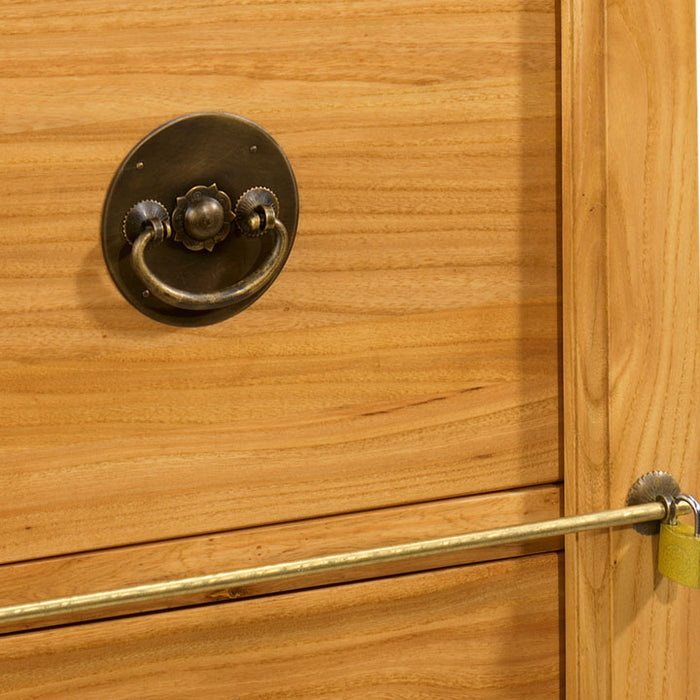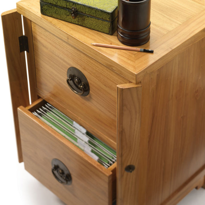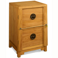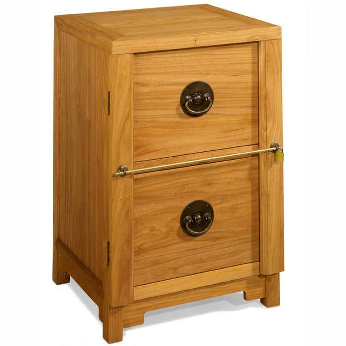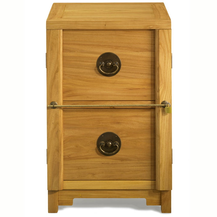 Adding a touch of oriental style to a home office, this small light coloured filing cabinet is in solid elm wood and has the same distinctive style as the larger version but with two drawers instead of five. Beautifully crafted, the cabinet provides an elegant way to store important documents, each drawer includes metal poles to fit standard A4 suspension files and the cabinet can be secured using the metal bar and padlock provided.