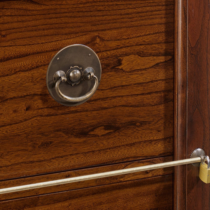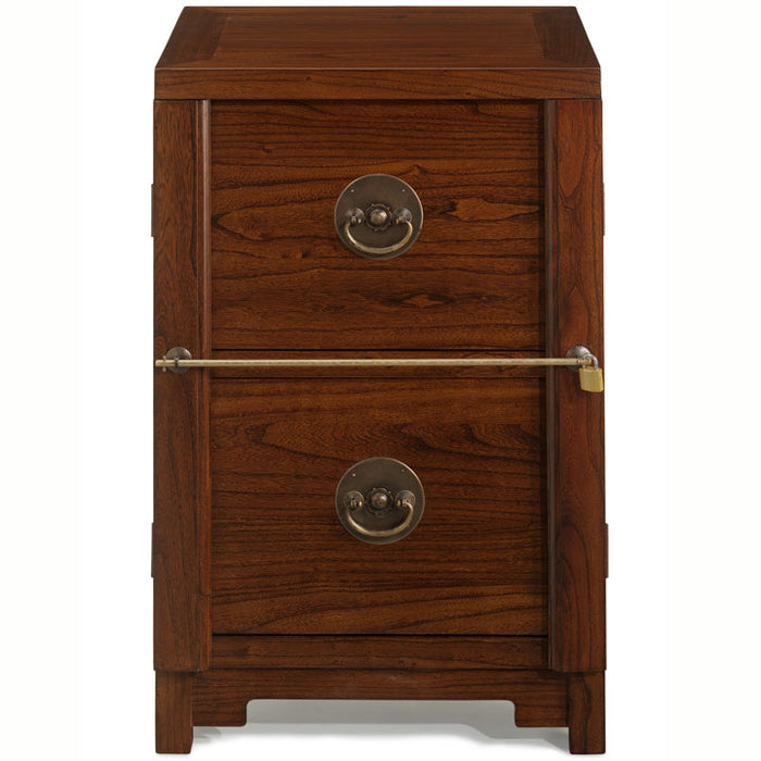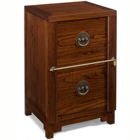 This small warm colour filing cabinet is in solid elm wood and has the same distinctive style as the larger version but with two drawers instead of five. Each drawer includes metal poles to fit standard A4 suspension files and the cabinet can be secured using the metal bar and padlock provided. Beautifully crafted, the cabinet provides an elegant way to store important documents, adding a touch of oriental style to a home office.