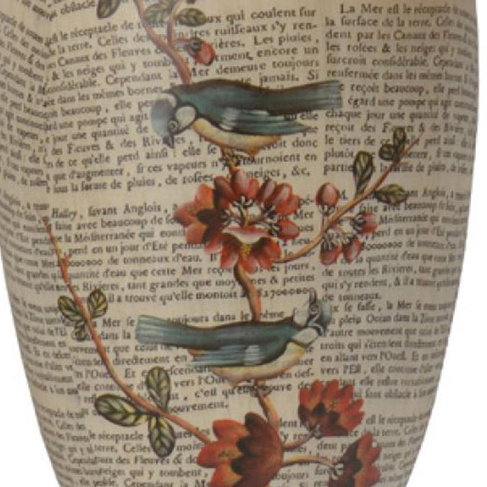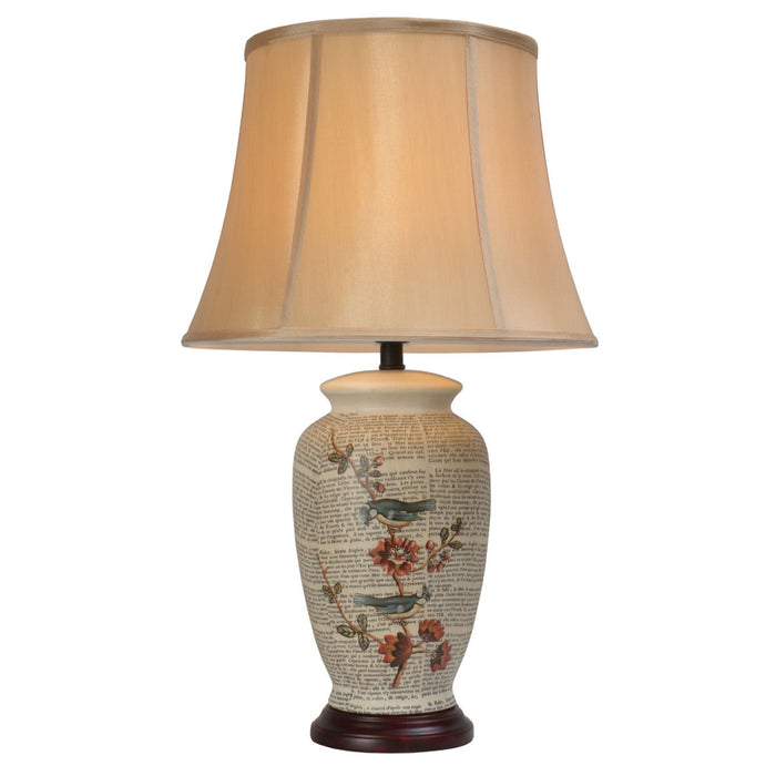 This lovely vase lamp is decorated with bluetits among flowering quince branches against a backdrop of aged newsprint. Supplied with the gold faux silk shade as shown.