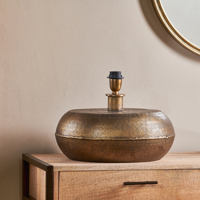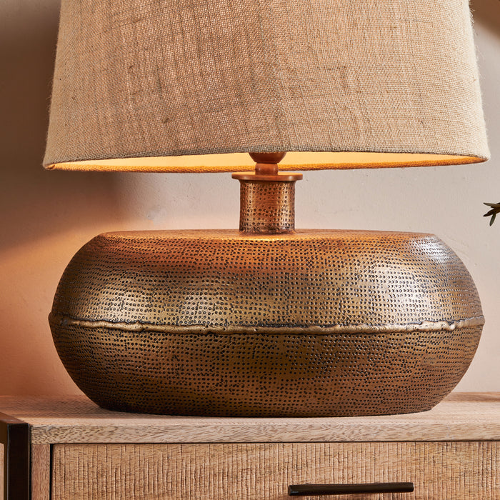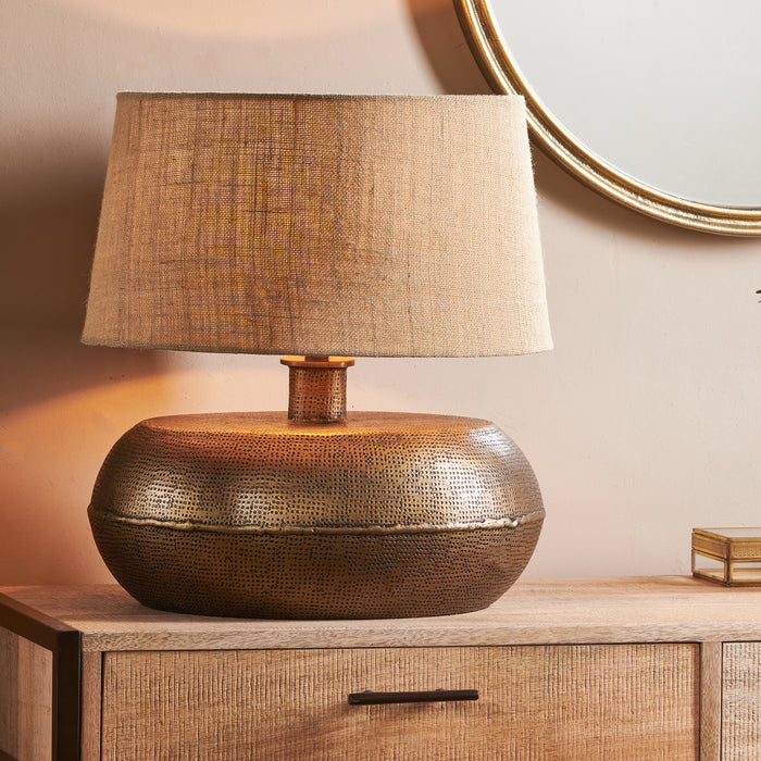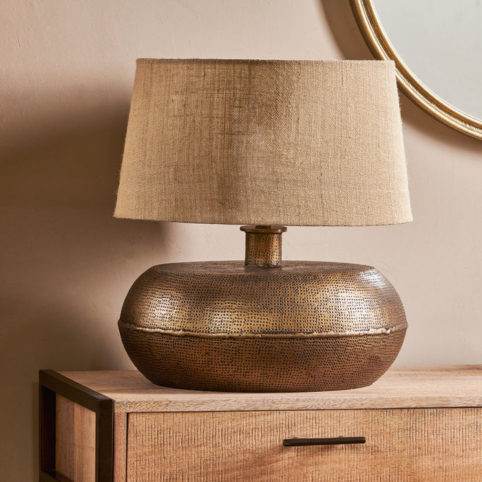 These lovely lamps are in a hammered, antique brass finish. Available in two sizes, they come with a brown fabric cord. Finish off with one of our dia jute lampshades (sold separately).