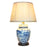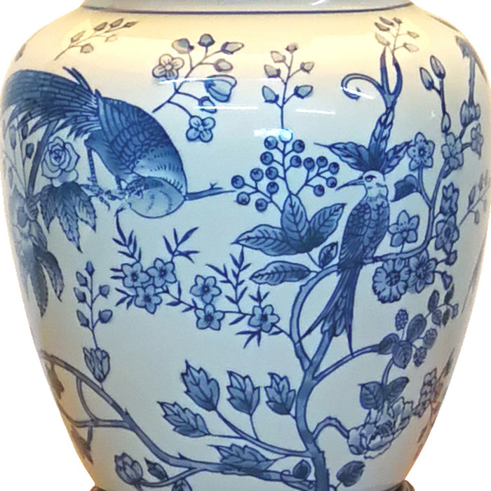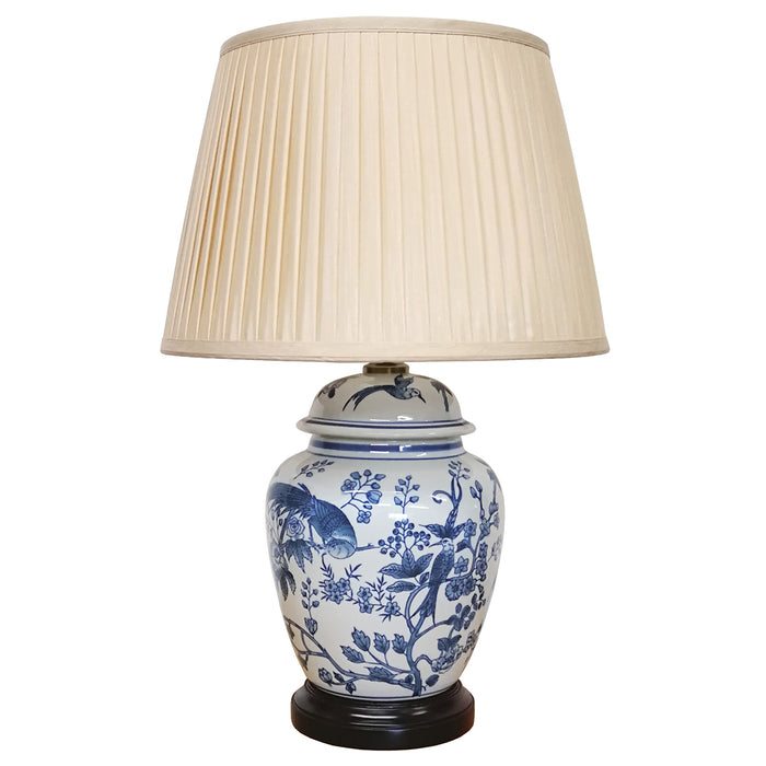 Complete with a gold pleated and lined faux silk shade, this wonderful jar lamp is decorated with a classic blue and white design showing various tropical birds among blossom branches. The base is made from hardwood, with a gold foil finish.
