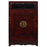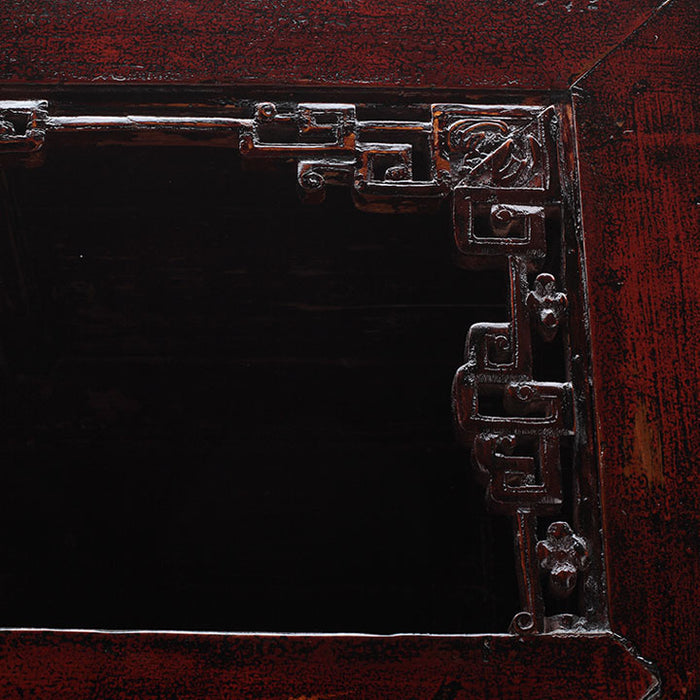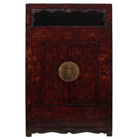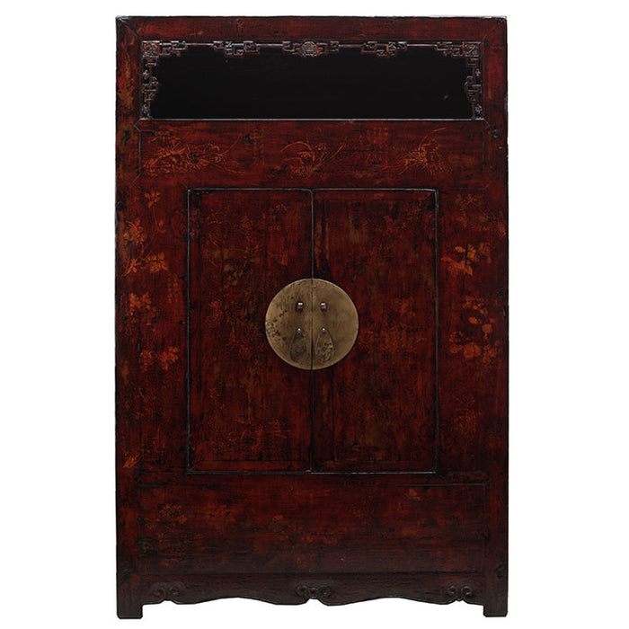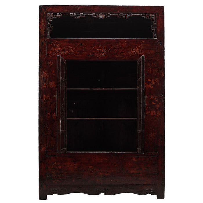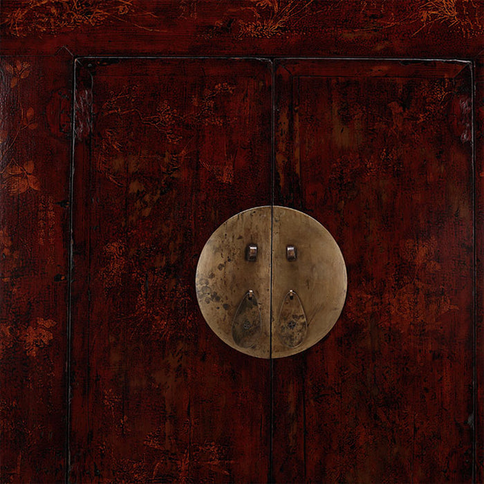 This stunning painted armoire, with its impressive size and proportions, would make a fantastic statement piece - though you would need a large space to house it! It comes from Shanxi province in central China and still has its original red lacquer finish and paintings. This style of cabinet, with an open shelf section above the doors, is known as 'wanli' in Chinese. The top shelf is framed with wonderful open carvings that include a central long life symbol and a bat (symbolising good fortune) at each corner. This would have held prized ornaments, with books and other personal items stored inside the cupboard section. The paintings on the doors and outer panels, now less vibrant than they once were but still clearly visible, show flowers, birds, butterflies and blossom in now muted browns. There are also inscriptions in Chinese characters painted just below the shelf and on the bottom apron - most likely messages for good fortune to the recipient of the cabinet or details of when and where it was presented. The artist's 'chop' is also still visible towards the top left of the cabinet. The heavy brass hardware is concaved and at 33cm diameter is in proportion to the doors. Inside the cabinet there are two removable shelves, as well as a third plank shelf that sits over the 'hidden compartment' at the bottom. This is a unique, extraordinary piece - sure to impose itself as the ultimate statement furniture in the right setting. Please note that it is extremely large and heavy so be sure to check access before ordering and call us to discuss delivery options.