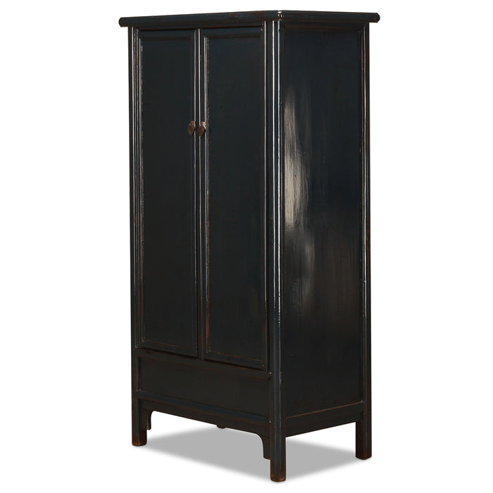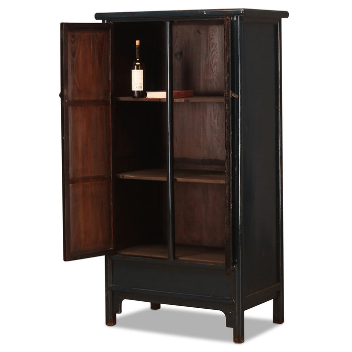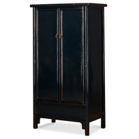 This style of cabinet has been seen throughout China for centuries and is unmistakably oriental in appearance. This one dates from the early 20th century, but has been restored with a new lacquer and door hardware. The post between the doors is a removable - an aesthetic feature that was introduced later on in Chinese furniture. With two removable shelves and a removable board hiding the 'secret' bottom compartment, the cabinet is perfect as a statement piece in a living room or used for bedroom storage.