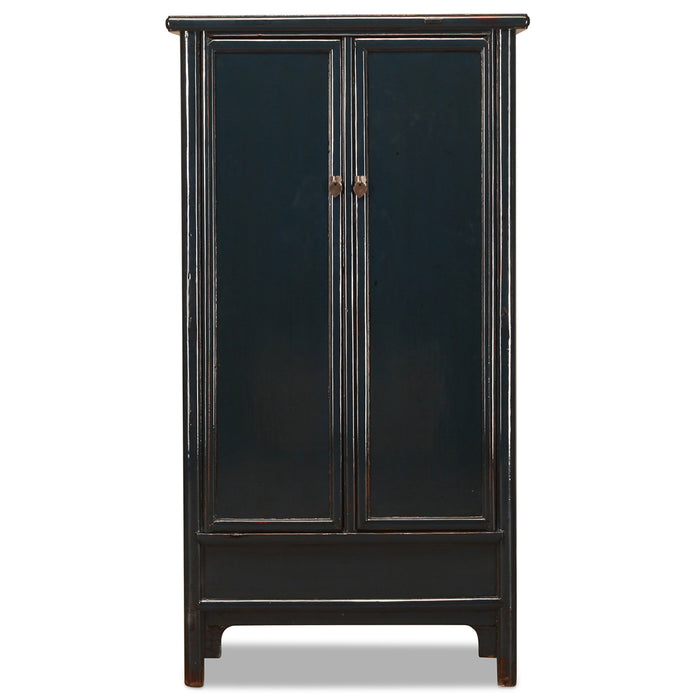 This sleek, teal blue lacquered cabinet is in a classic Chinese 'round cornered' style. The ingenious A-frame design includes doors that are mounted directly into the upper and lower frames of the cabinet on wooden dowels rather than metal hinges. This creates a pure, fluid, elegant look with a sense of upward movement. The door panels are fitted within rounded frames, with the top and outer frames, tapering out to the feet, also rounded.