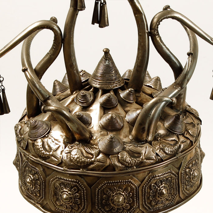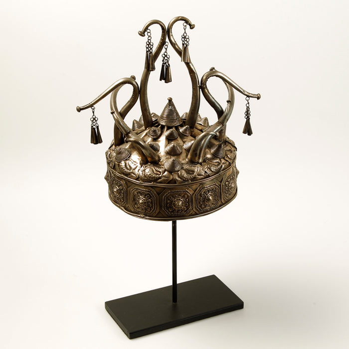 These wonderful headdresses are produced by the 'Miao' ethnic minority of southern China and worn as part of their traditional costume. They are made from metal and silver plated, The decoration includes fish around the outside - symbols for good luck. Each headdress comes with a metal stand, and they make highly unusual decorative items.