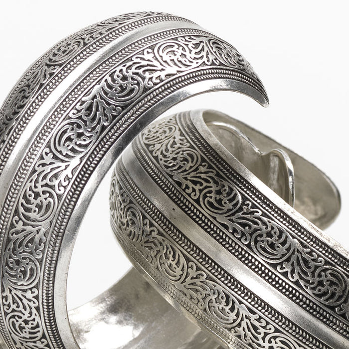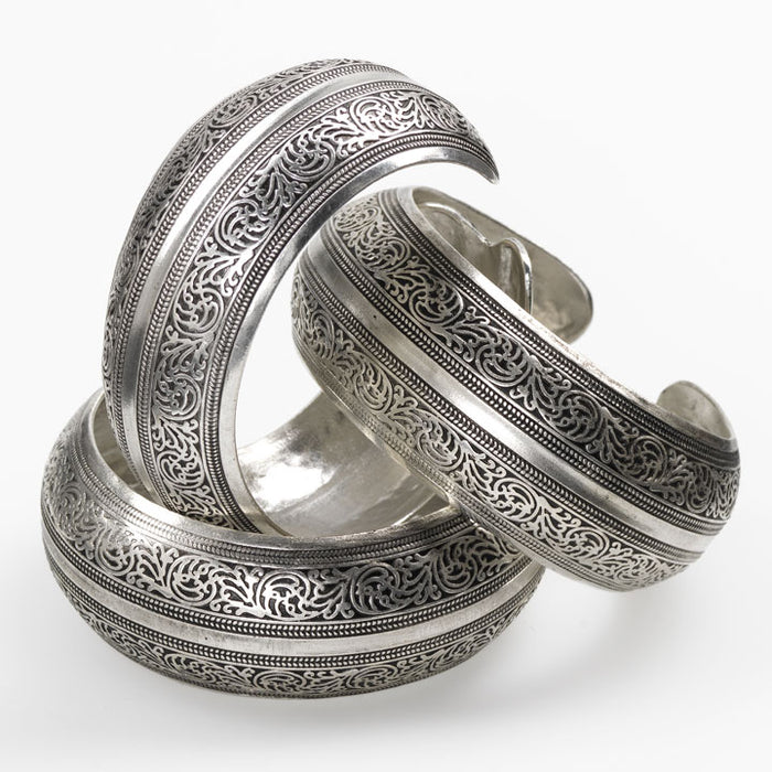 Traditional to the Miao people of Southern China, these lovely bracelets are produced by hand. Made from a base metal and silver plated, they are soft enough to shape to the size required.