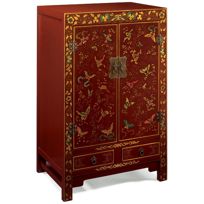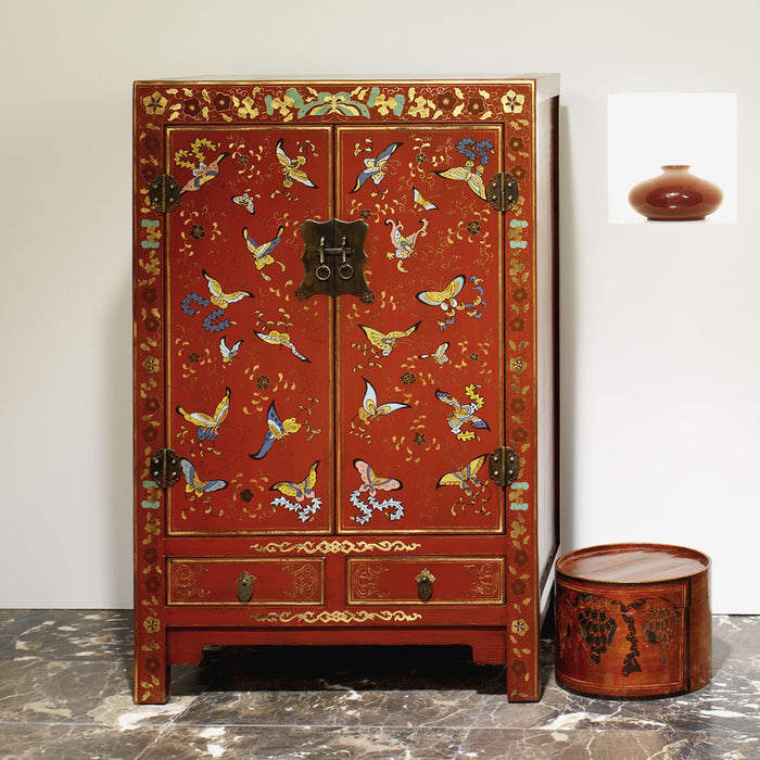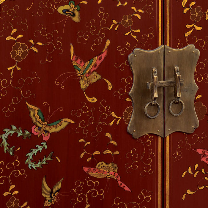 Finished here in a rich red lacquer, these stunning painted cabinets are decorated with gold and painted by hand, so each one is individual. They are based on the wonderful pieces produced for centuries in Shanxi province in central China. For the Chinese the butterfly is a symbol of beauty and especially of marital happiness - often seen painted on armoires and trunks from Shanxi that were to be given as part of a bride's dowry. In a modern home our reproduction versions are suitable for use as TV cabinets (ask about our made to order service if you have a large TV), as drinks cabinets or for general storage. Each one has three removable shelves inside. Note that as they are decorated by hand, the painted designs on each cabinet can differ very slightly from the examples shown. Also available in black lacquer or cream lacquer. Other colours can be made to order.