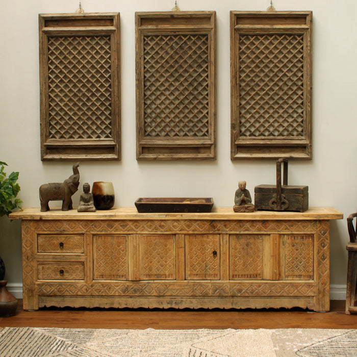 These traditional wooden panels are from a home in China's Shanxi province, where they would once have been used as part of a set of window panels in a traditional courtyard home. The clean, criss cross lattice design at the center of each panel is surrounded by chunky elm frames. The panels would be ideal today as a distinctive and wall accent above a console table or sideboard. Sold as a pair, the price shown is for both panels. Two similar pairs are currently available.