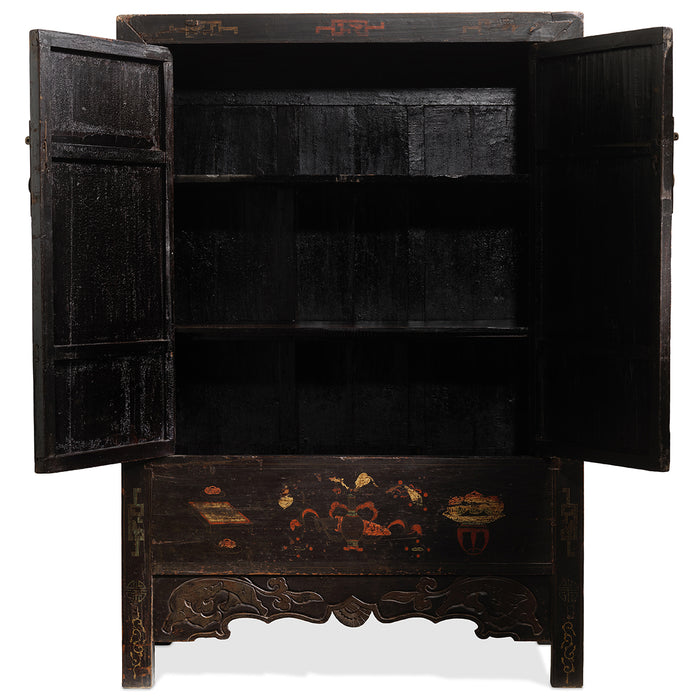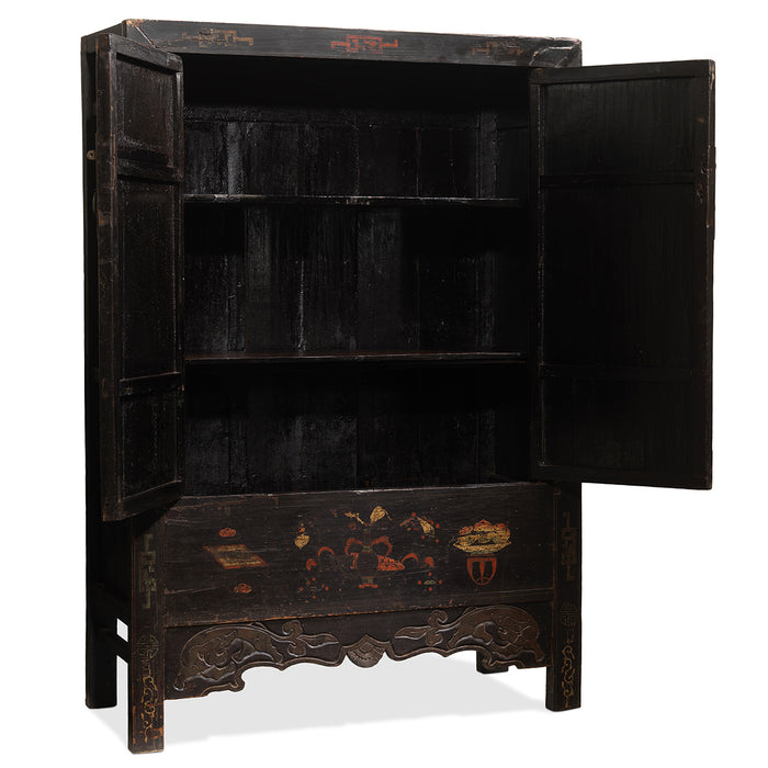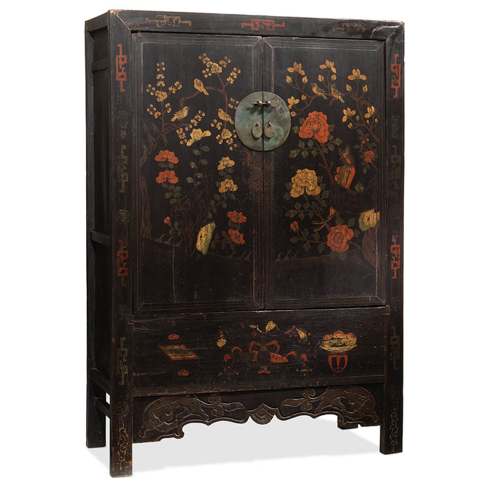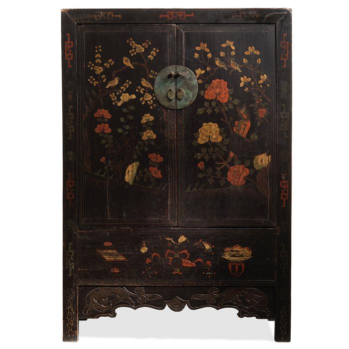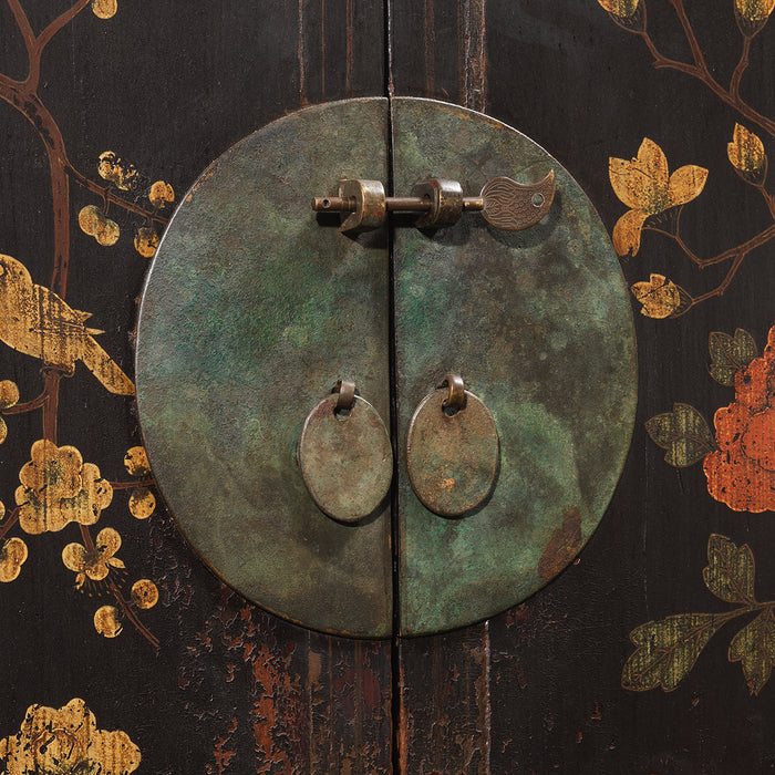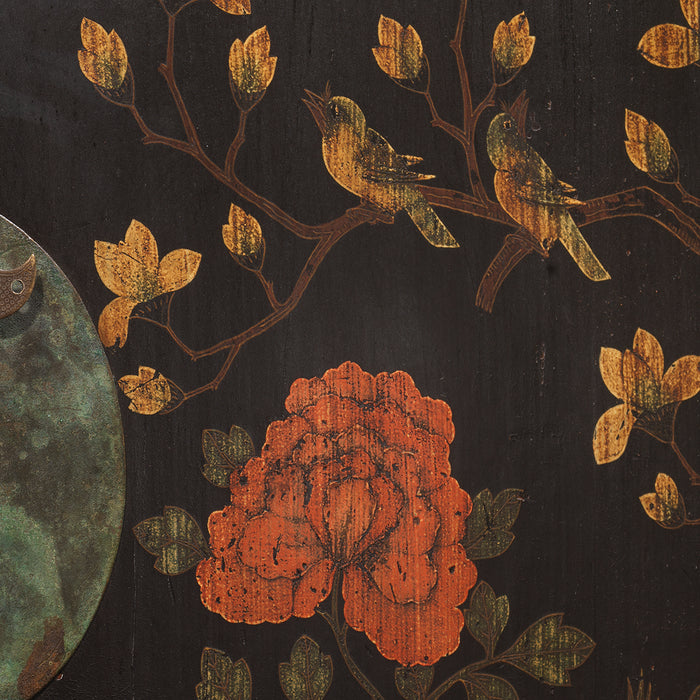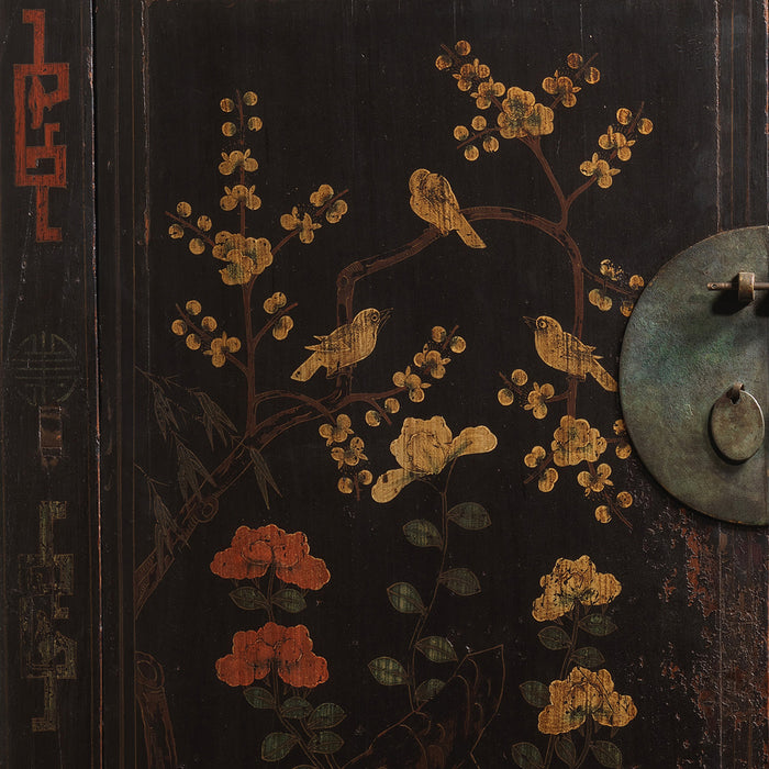 This Chinese antique cabinet dates to the late nineteenth century and originates from Shanxi province, an area renowned for its finely crafted lacquered furniture. The cabinet is a striking example of late Qing dynasty artistry, combining strong architectural form with richly decorative surface work. Finished in a deep, time-softened black lacquer, the cabinet’s doors are hand-painted with delicate scenes of flowering branches and birds. The colours—muted reds, warm ochres and soft greens—have mellowed beautifully with age, creating a subtle contrast against the dark background. At the centre of the doors sits an original circular metal lock plate with twin drop handles, its gently oxidised surface adding further character.