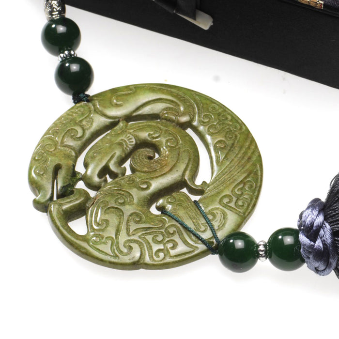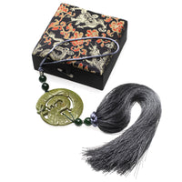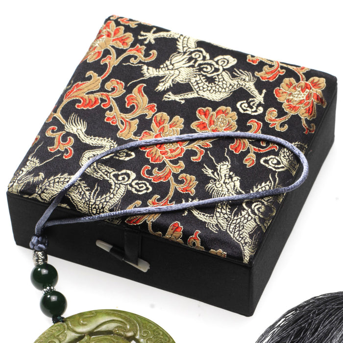 A coiled dragon carved from jade forms the centrepiece of this lovely ornament, with dark green beads either side and a faux silk tassel in grey. Perfect as an add on for our cabinets and antiques, it comes with a decorative presentation box as shown, which makes a lovely keepsake or jewellery box in itself. Dimensions shown are for the tassel.