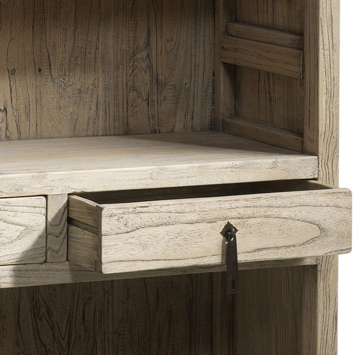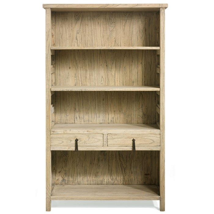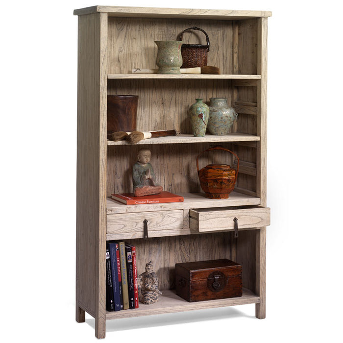 Our bookshelf is nicely sized and proportioned to use in a living room or home office, the beautiful wide grain of the solid elm wood providing an attractive backdrop to either books or ornaments. Simple in style, the shelves are produced in a frame and panel design with an extended top - in keeping with other pieces in our Chinese Country Elm Furniture range. The lower, fixed shelf includes two shallow drawers, while the two upper shelves are removable, with four sets of shelf holders allowing them to be positioned where required.