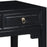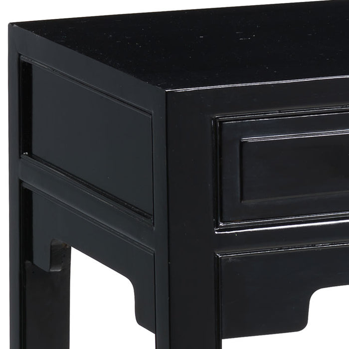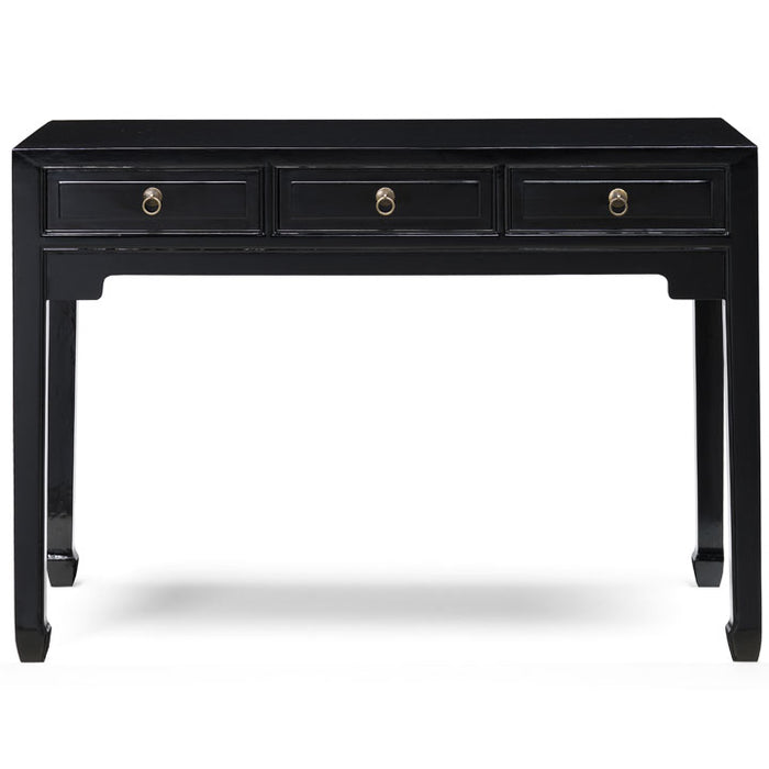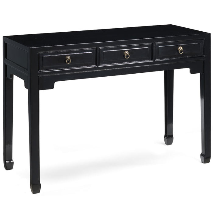 Made from solid wood, our black lacquer desk works beautifully as a dressing table, as an elegant hall table or as a narrow desk with useful storage in the drawers. Tables like this, simple in style with two or three drawers, were commonly used by Chinese scholars of the Qing dynasty. The 'horse hoof' shaped feet and curved aprons that stretch between each leg give it a distinctive oriental feel but otherwise the style is quite plain, with simple ring handles on each of the three drawers.