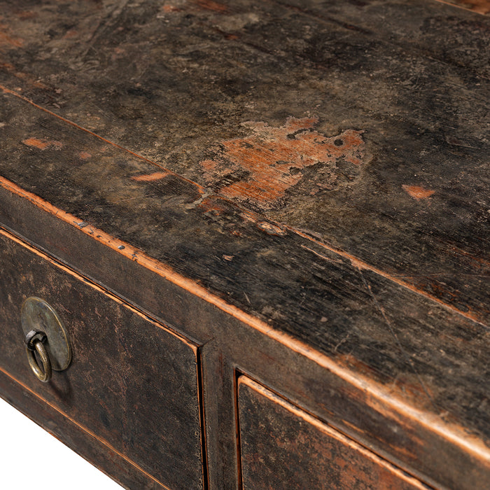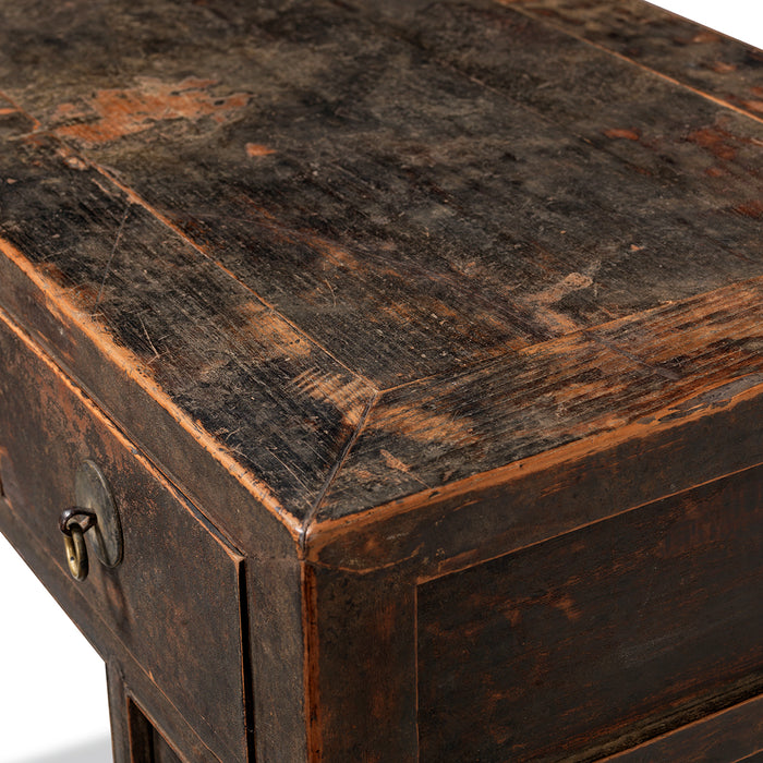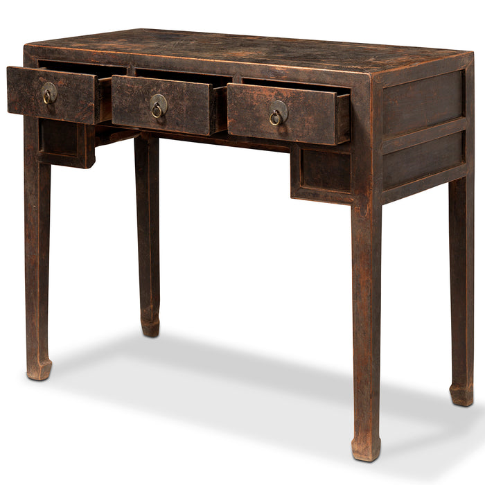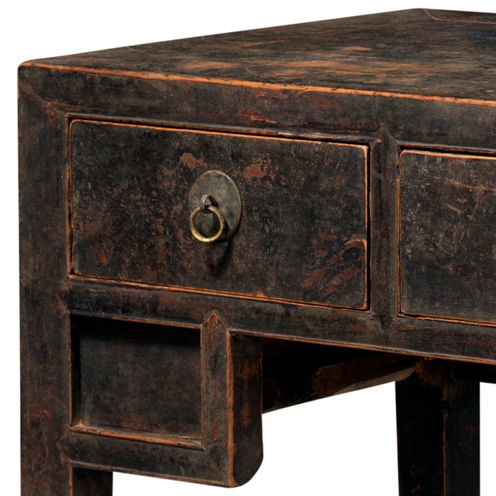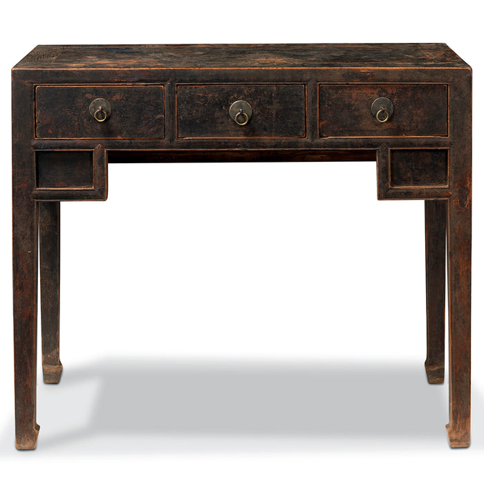 Produced in Shanxi province in the late nineteenth century, this beautiful antique desk would work perfectly in a home office, or could be used as a unique, characterful dressing table. The finish and detail is all original, the once deep, rich black lacquer worn over the years to give a more varied, multi-tone colour with a wonderful patina particularly on the top surface. The desk is made from poplar wood, in a typical frame and panel design with legs that end in classic horse hoof feet.