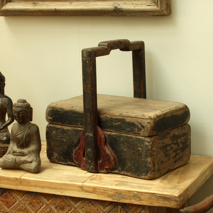 This old storage box with a carrying handle was used to transport food. It has its original finish - the black lacquer now severely worn to show the elm wood underneath, with the decorative side mouldings picked out in red.