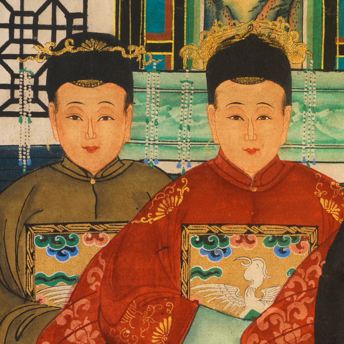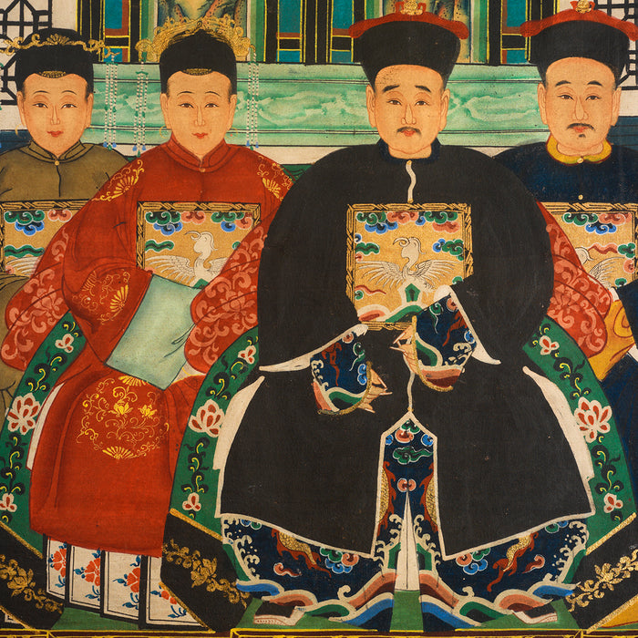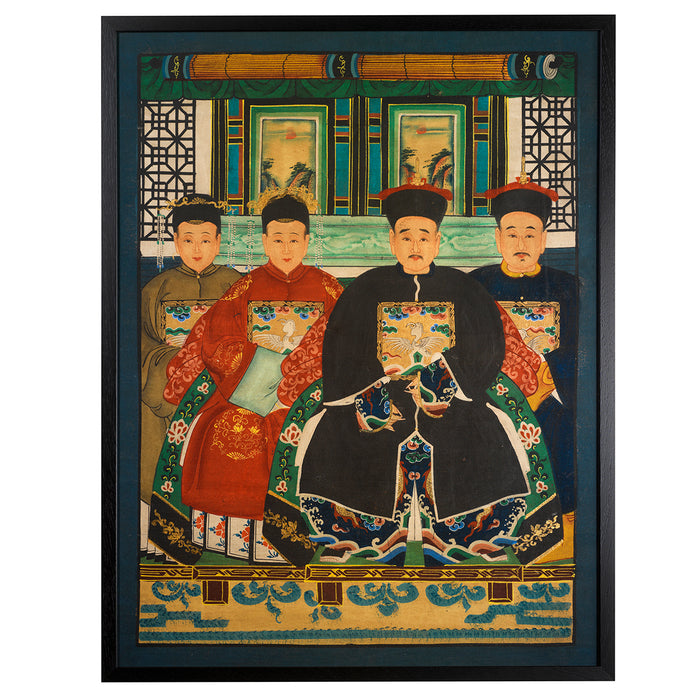 Ancestor paintings like this one were an important part of the widespread Chinese practice of ancestor worship. Families would remember and worship their ancestors with offerings placed in front of these paintings. Portraits were painted from front on and usually close to life size, with the subjects normally seated and wearing robes to show their rank badge. In many cases the portrait would be of a single ancestor, but they could also be of a couple or even of several generations. Original ancestor paintings are now quite rare, so our paintings are reproductions and smaller in size, but are accurate versions of the originals. They are supplied mounted and framed as shown. This one depicts a small family, with a mother and father seated in the centre and their children at either side.