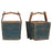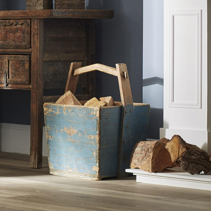 These old buckets have been restored and refinished in a distressed matt blue on the outside, but the shape, including the curved handle, is original. Great for logs, kindling wood or magazines.