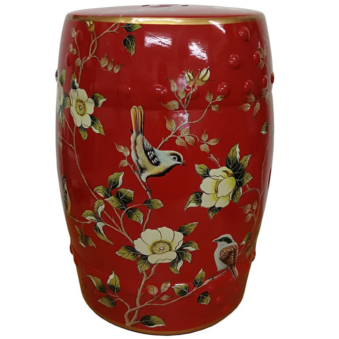 This stunning painted ceramic stool is in a rich red and shows chaffinches perching amongst flowering Peony branches.
