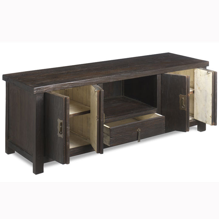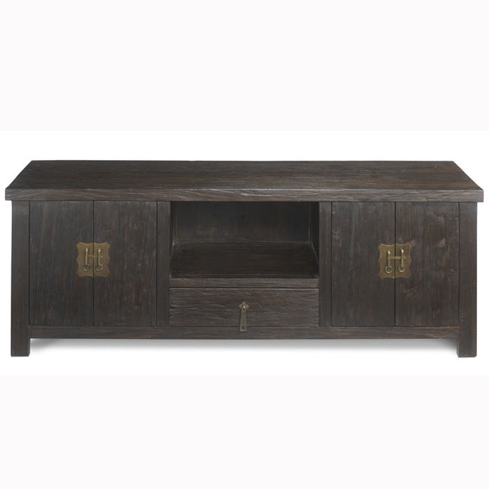 Perfect as a TV stand, this long, low cabinet has an open shelf in the middle to hold a DVD player or digital box and is finished in a dark, rich chocolate finish. A chunky plank top extends over the thick side frames and the doors are fitted directly into the frames on wooden dowels. There is a single removable shelf inside each of the two cabinet sections and shaped brass hardware completes the look.