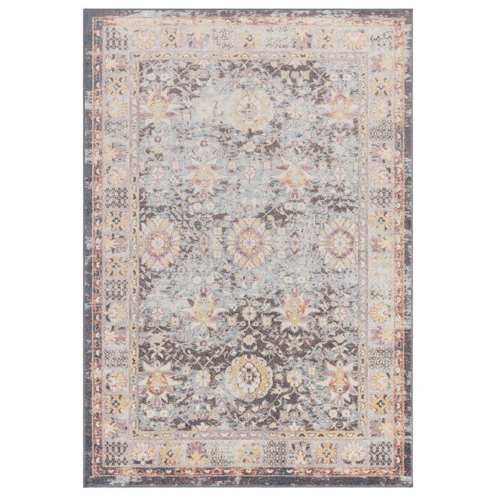 The Gita rug has a rich, dark background which enhances the beautiful floral motifs that are coloured in golds, reds and pale blues.